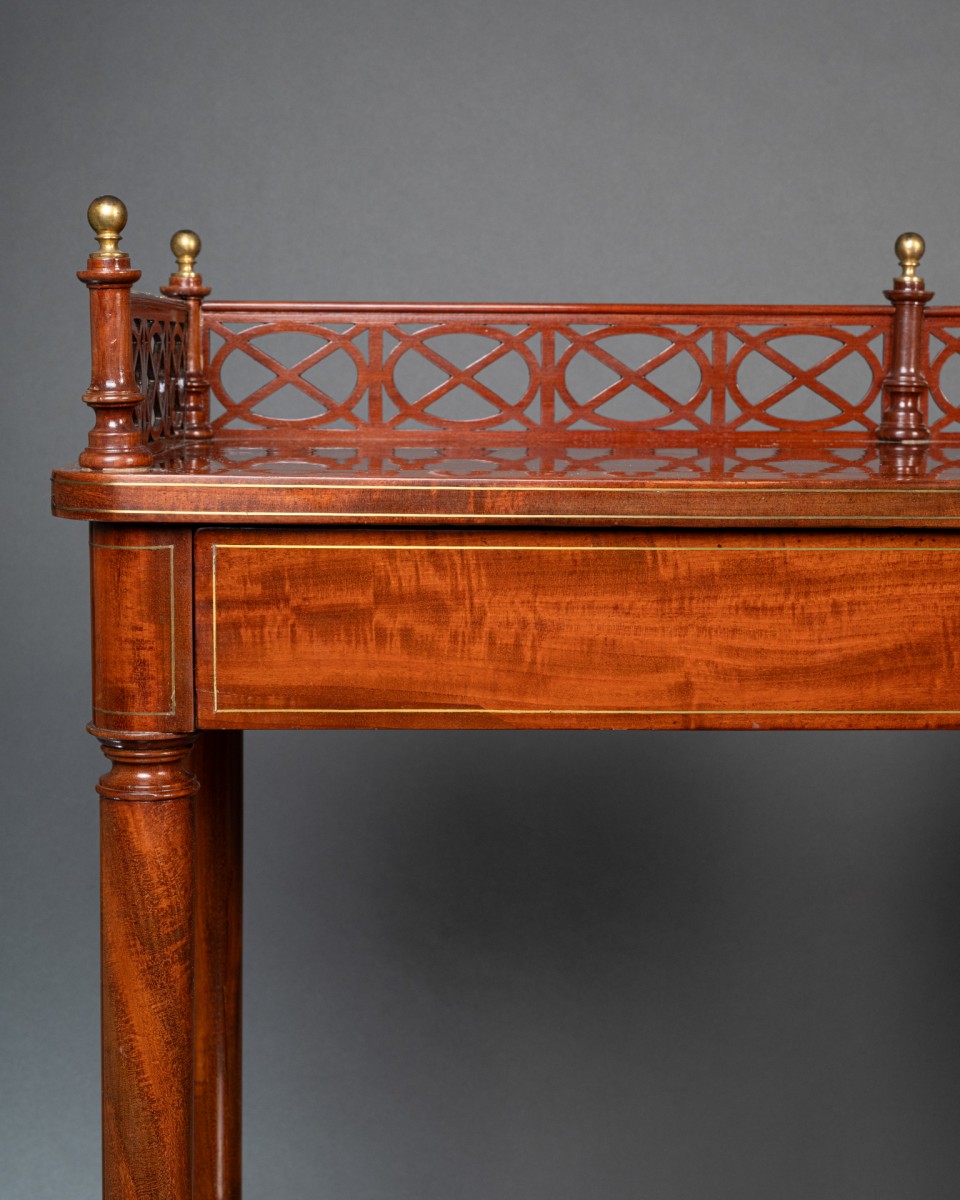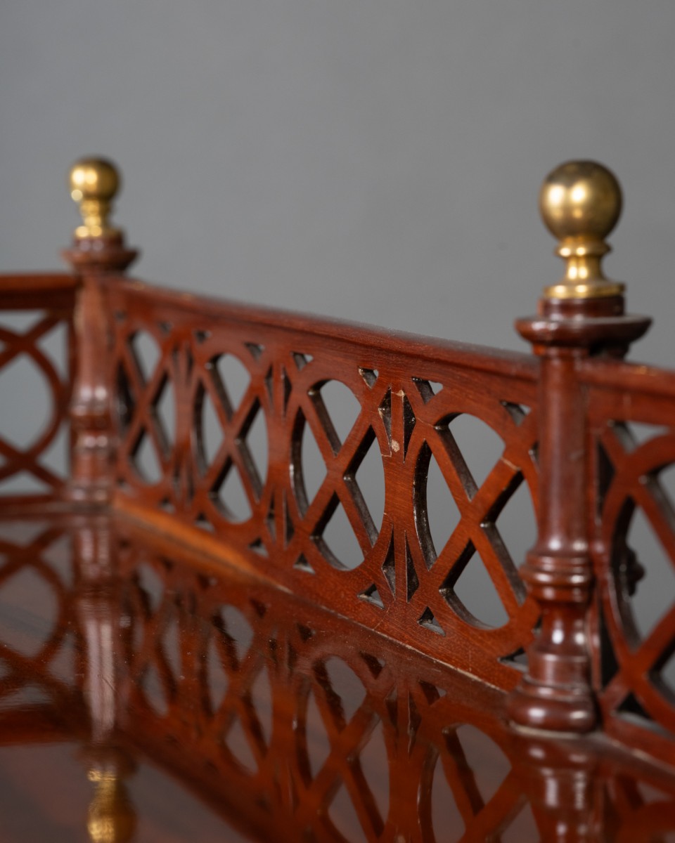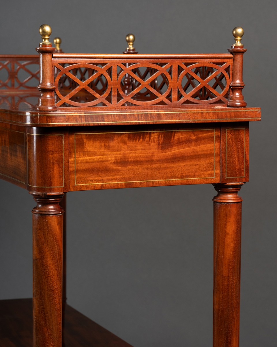 Les quatre plateaux en acajou sont soulignés de filets de laiton, le plateau supérieur, qui abrite un tiroir, est cerné d’une élégante bordure ajourée en acajou, ponctuée de balustres couronnées de sphères en bronze doré. Les pieds fuselés et annelés sont terminés par des sabots de laiton.