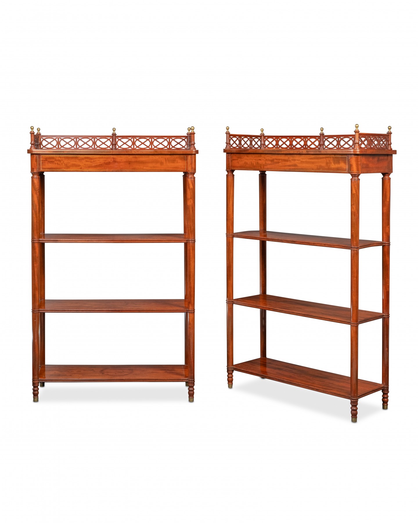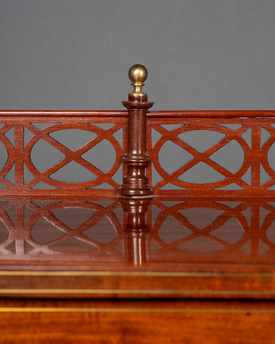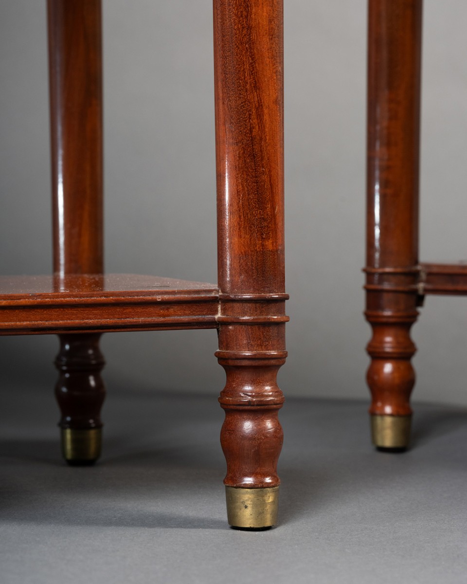 Les quatre plateaux en acajou sont soulignés de filets de laiton, le plateau supérieur, qui abrite un tiroir, est cerné d’une élégante bordure ajourée en acajou, ponctuée de balustres couronnées de sphères en bronze doré. Les pieds fuselés et annelés sont terminés par des sabots de laiton.