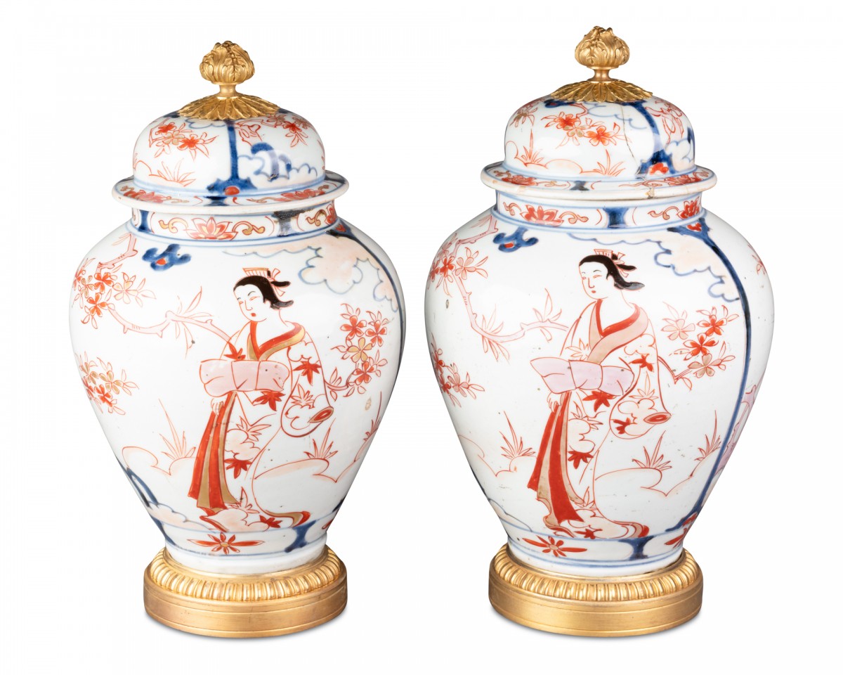 Paire de potiches en porcelaine à couvercles ; Imari , période Edo XVIIéme siècle . Monture en bronze ciselé et doré faite en france au XVIIIéme . Décors de jeunes femmes sur des terrasses arborées .