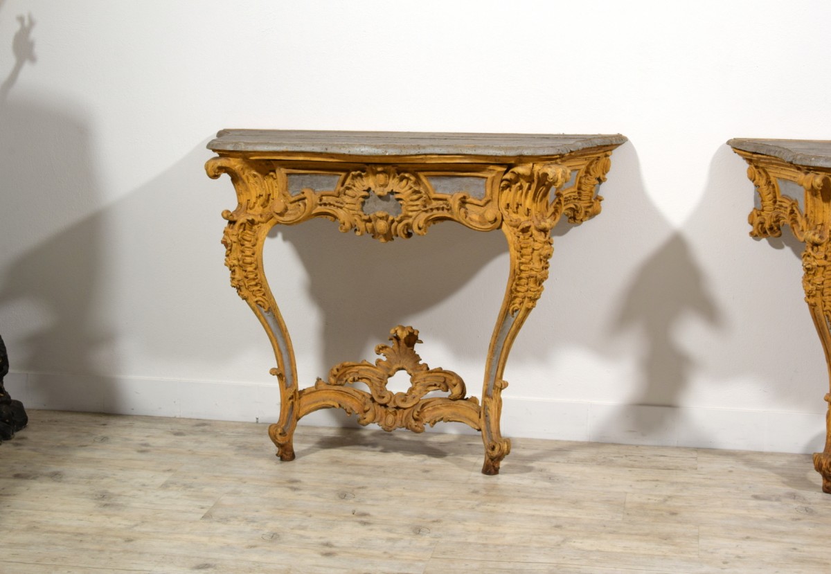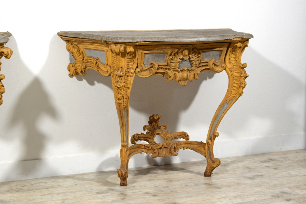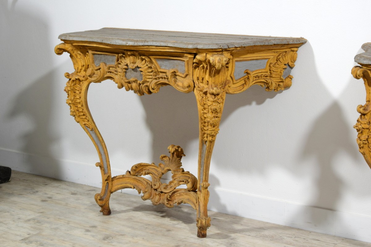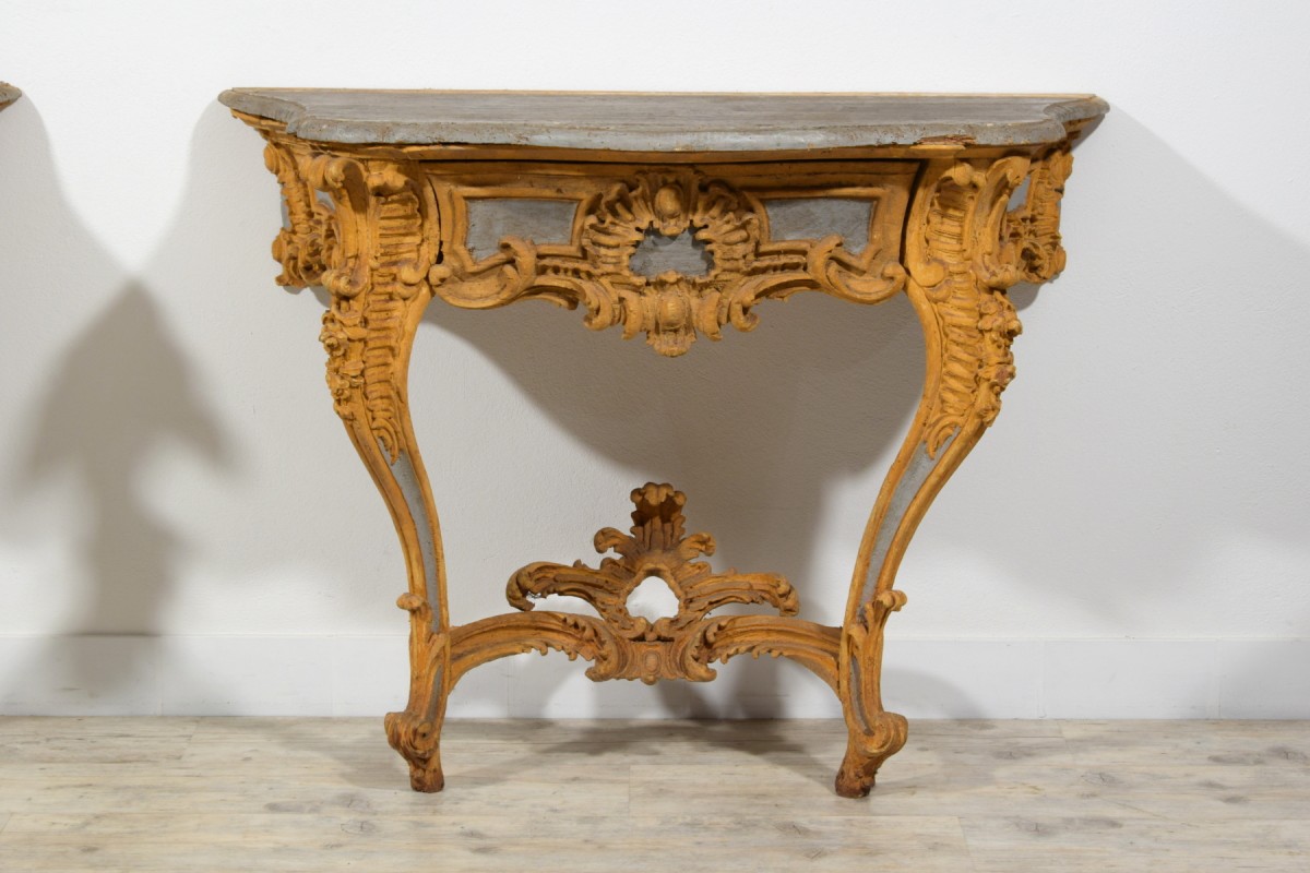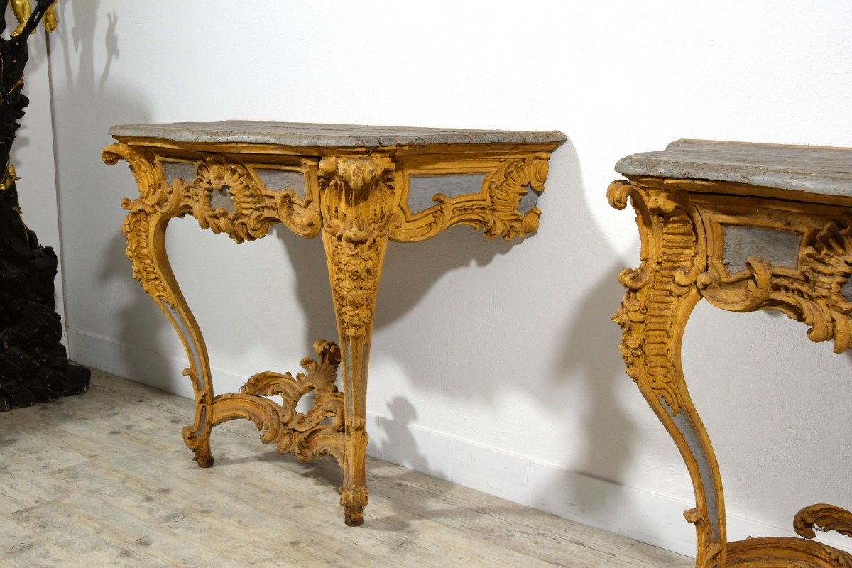 Retrouver le mobilier ou les objets d''art similaires à « Paire de consoles en bois sculpté et laqué, Italie XVIIIe siècle » présenté par Brozzetti Antichità, antiquaire à Cherasco dans la catégorie Console Louis XIV, Mobilier.