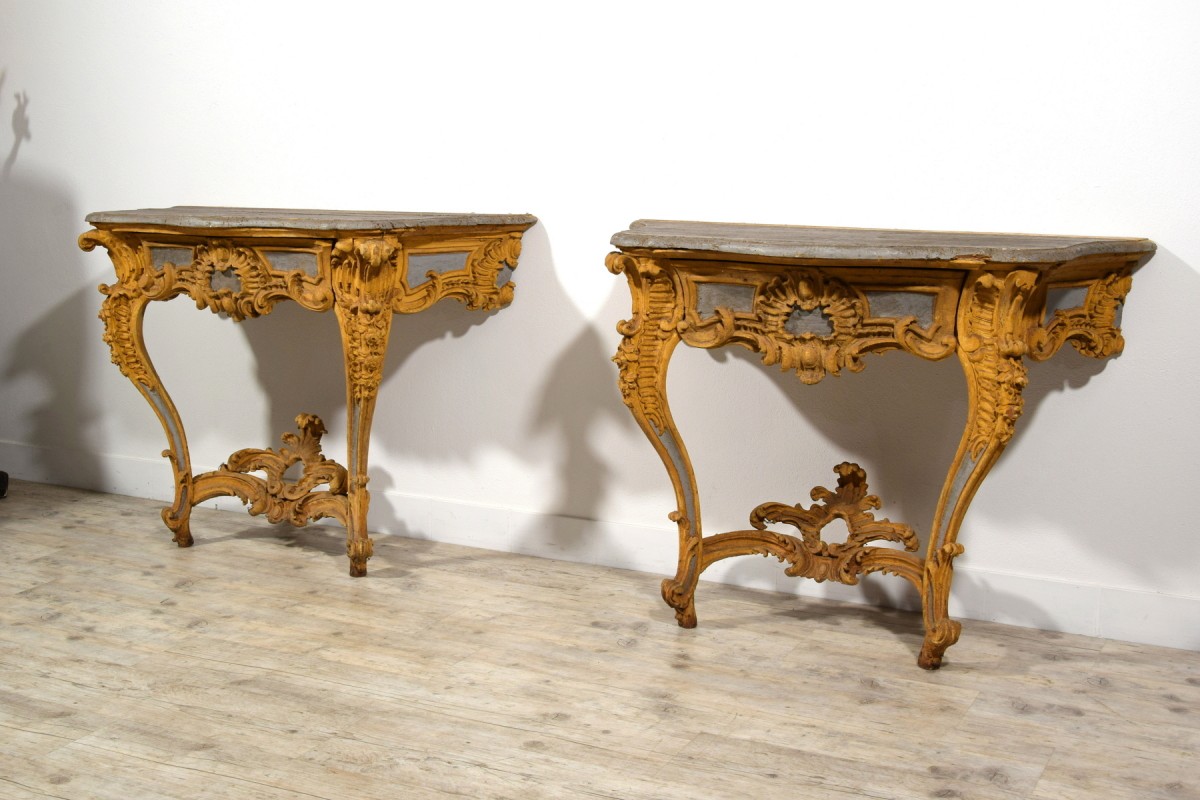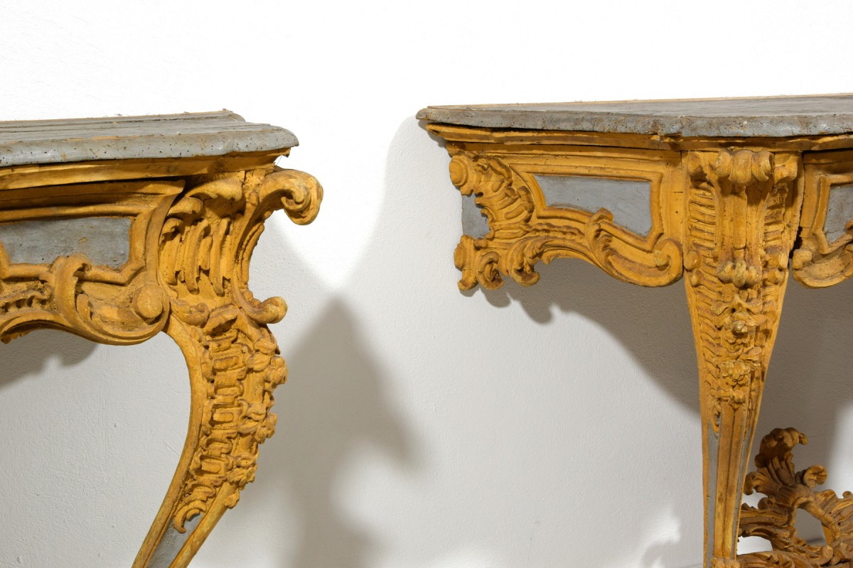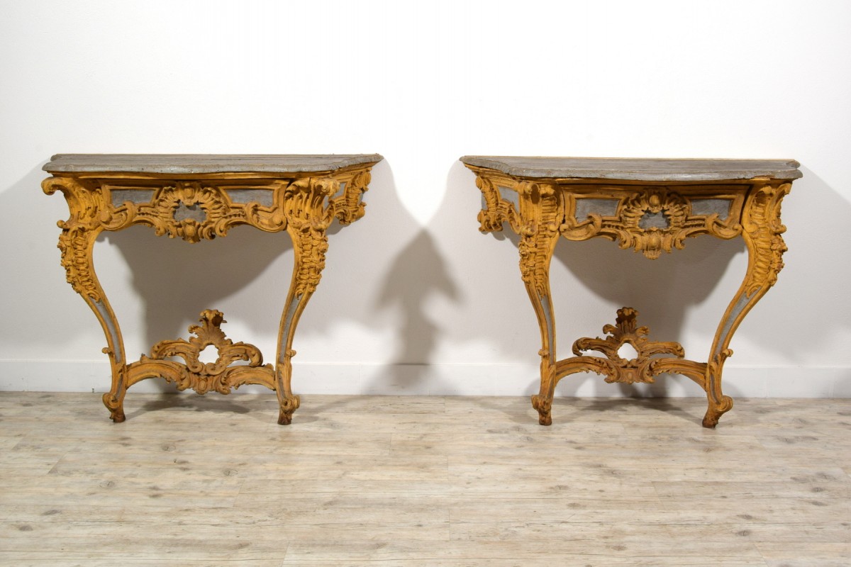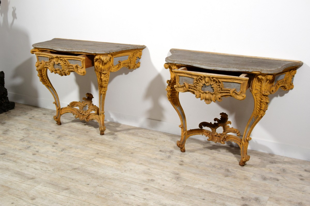 Retrouver le mobilier ou les objets d''art similaires à « Paire de consoles en bois sculpté et laqué, Italie XVIIIe siècle » présenté par Brozzetti Antichità, antiquaire à Cherasco dans la catégorie Console Louis XIV, Mobilier.