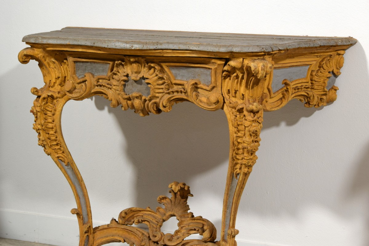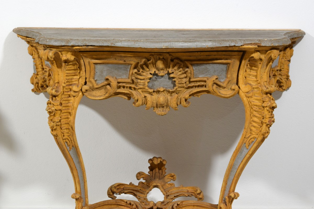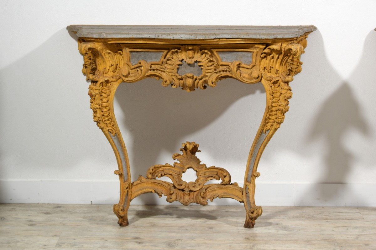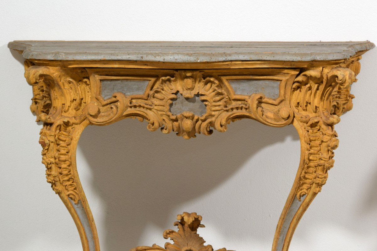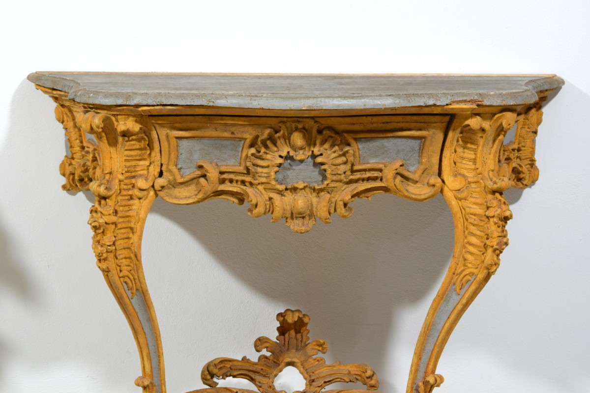 Retrouver le mobilier ou les objets d''art similaires à « Paire de consoles en bois sculpté et laqué, Italie XVIIIe siècle » présenté par Brozzetti Antichità, antiquaire à Cherasco dans la catégorie Console Louis XIV, Mobilier.