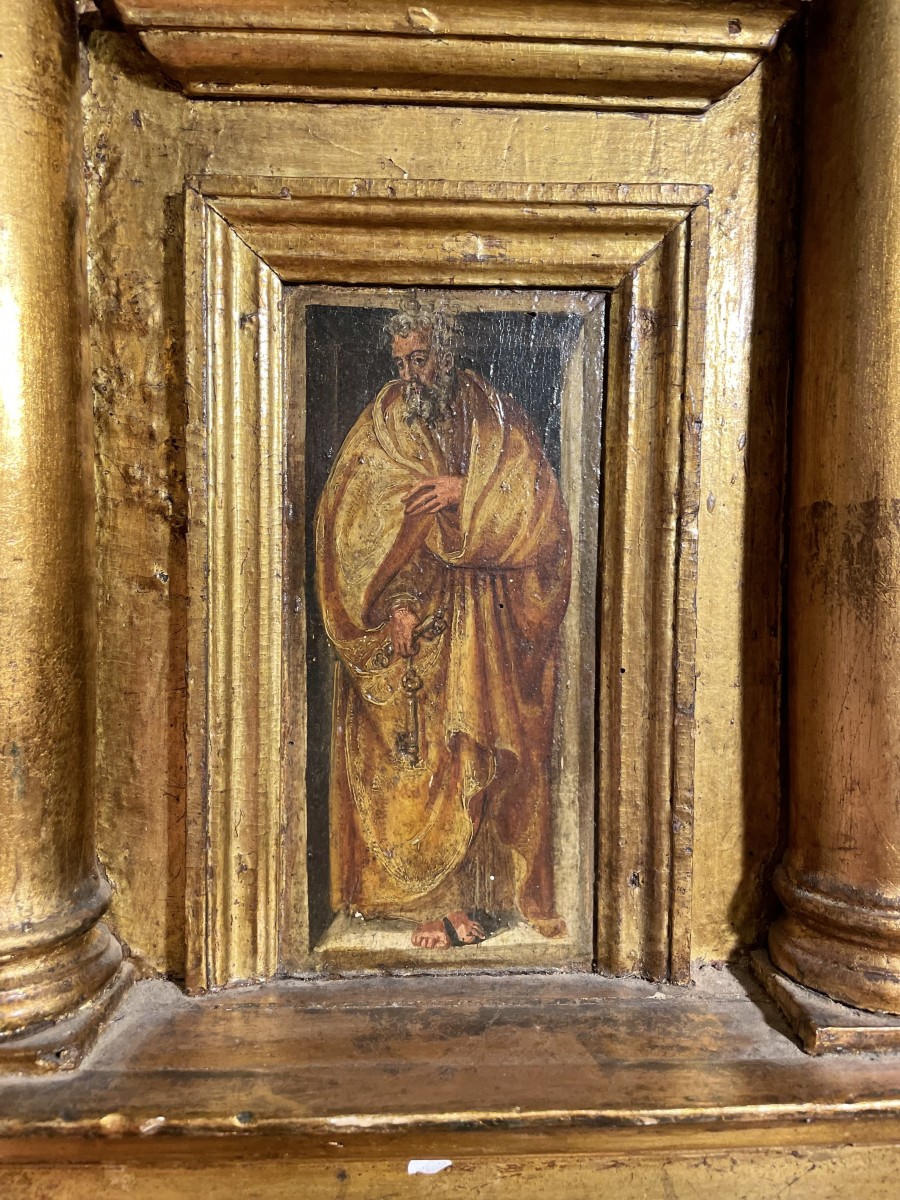 Saint Paul et Saint Pierre, avec leurs attributs respectifs sont les gardiens de ces deux éléments en bois d'un retable de forme architecturée.