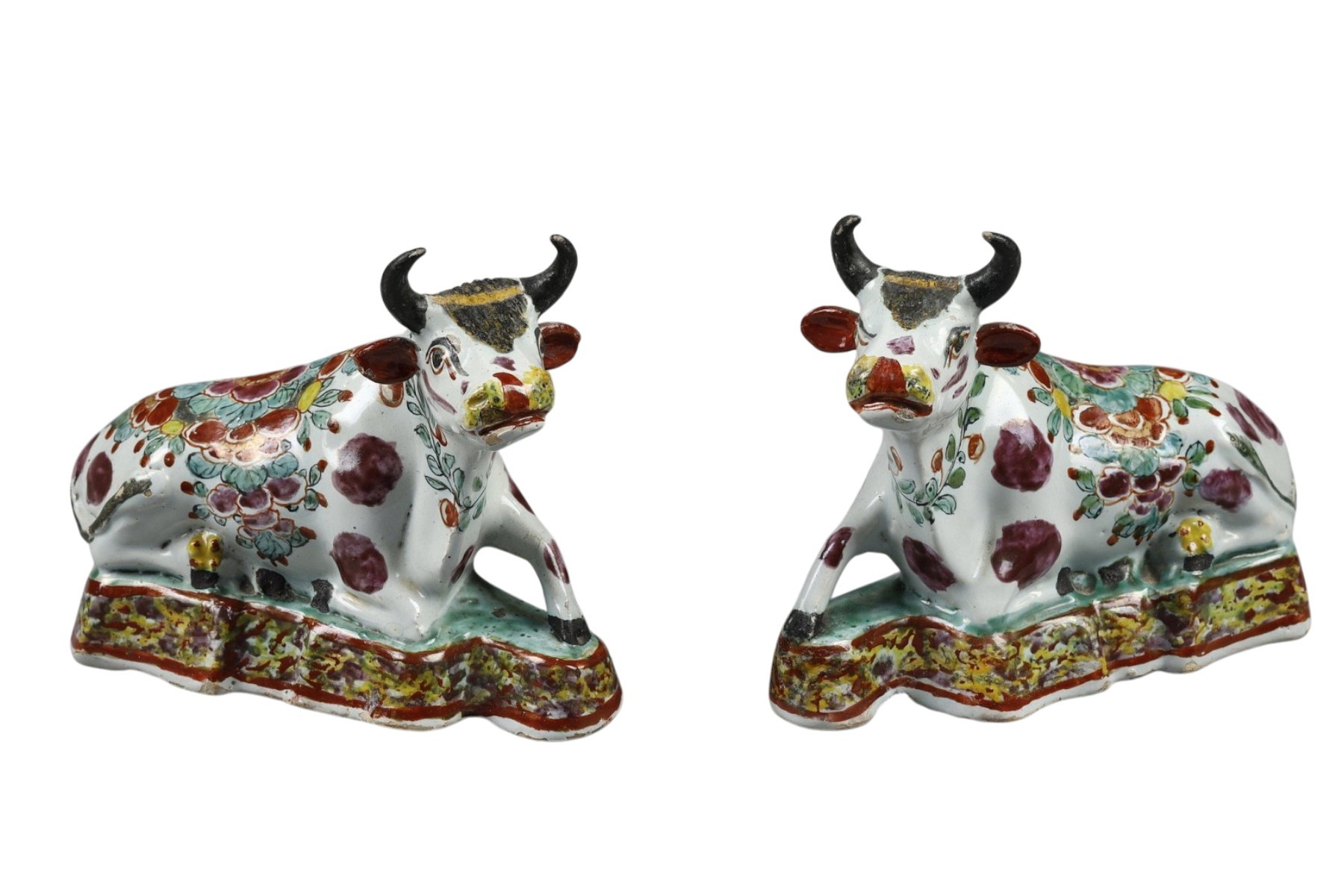 Delft : paire de vaches couchées en faïence décorées en petit feu dans le style chinois de la famille rose de fleurs traitées en polychromie et de taches roses sur le pelage . Les tertres verts cernés de motifs imitant le marbre. Seconde moitié du 18e siècle.
