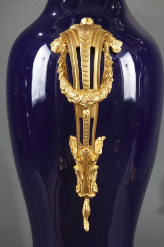 Grande paire de vases-candélabres de forme balustre à sept lumières, en porcelaine gros bleu et bronze ciselé et doré. Les bras de lumière, ornés de rinceaux et de pampres, sont réunis par d’élégantes guirlandes de cristaux taillés en prismes et mirzas. Deux anses ajourées ornées de feuillages et d’une guirlande encadrent la panse.