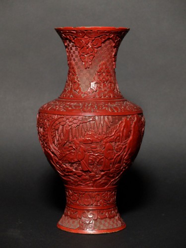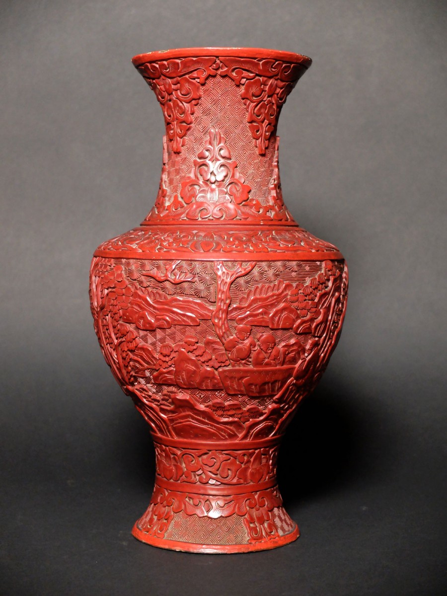 Paire de vases en laque de cinabre à décors sculptés en relief de personnages dans des paysages. Les cols sont ornés de rinceaux feuillagés.