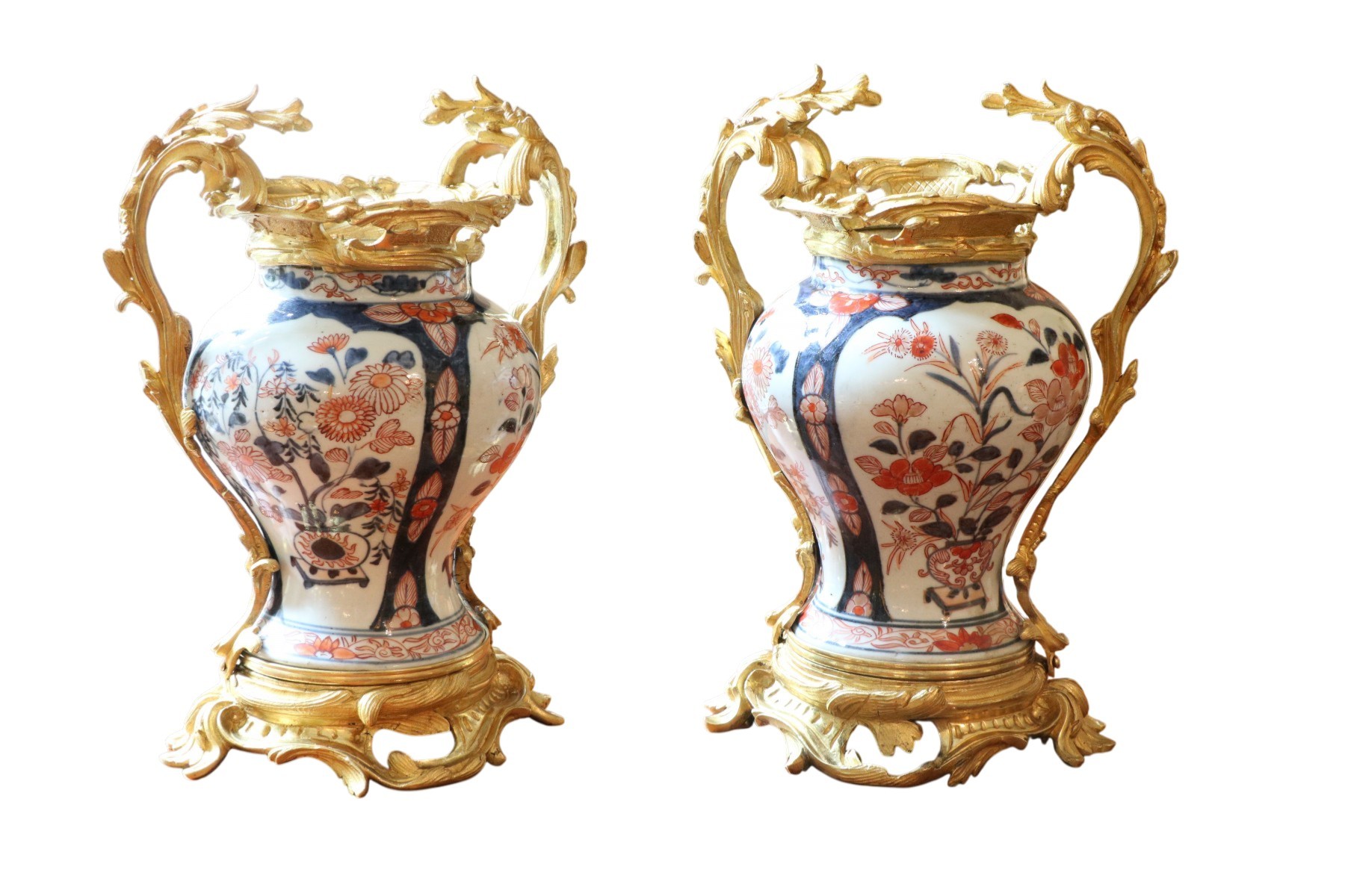 Paire de vases en porcelaine Imari du Japon orné d’une monture feuillagée en bronze doré. La porcelaine arbore un décor de bouquets floraux dans des encadrements à la bordure chantournée qui rappelle la silhouette galbée du vase. Les bronzes dorés et ciselés sont ajourés et présente des rinceaux qui évoquent parfaitement le style rocaille.