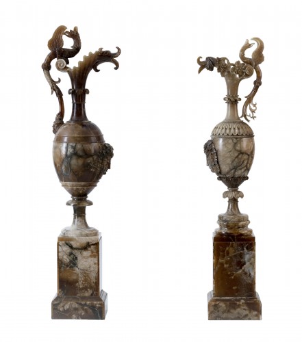 Le modèle des vases est inspiré des aiguières à vin de la Rome antique et décoré dans un style néo-renaissance d'animaux fantastiques et mythologiques, de raisins et de feuilles. L'avant des vases est sculpté de visages romains ornés de raisins et de feuilles de vigne.
