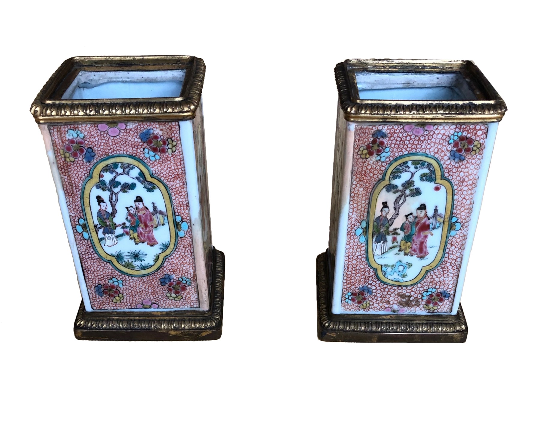 Une paire de vases carrés en porcelaine de Chine, Famille Rose d’époque Qianlong à décor de personnages Chinois.