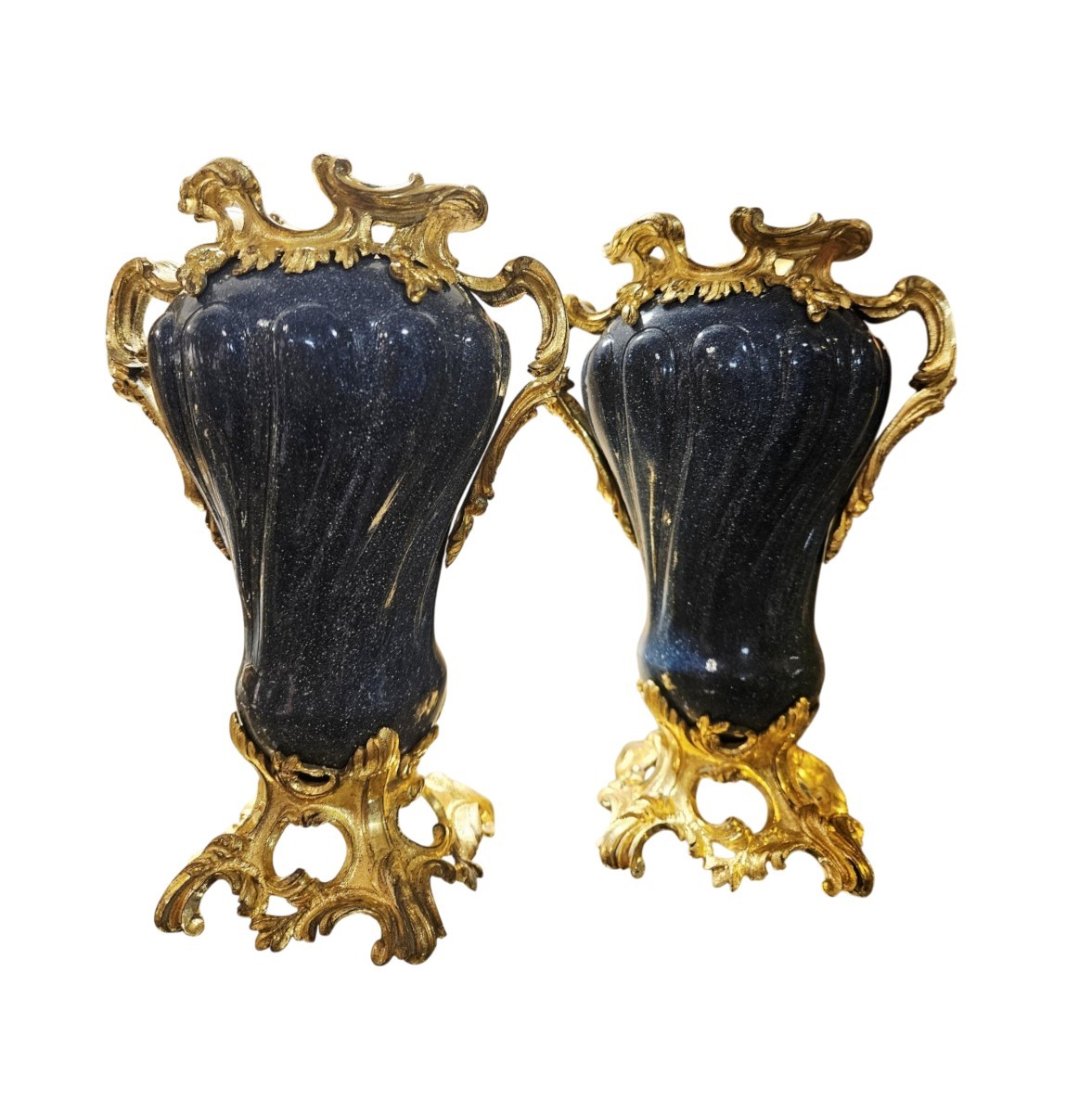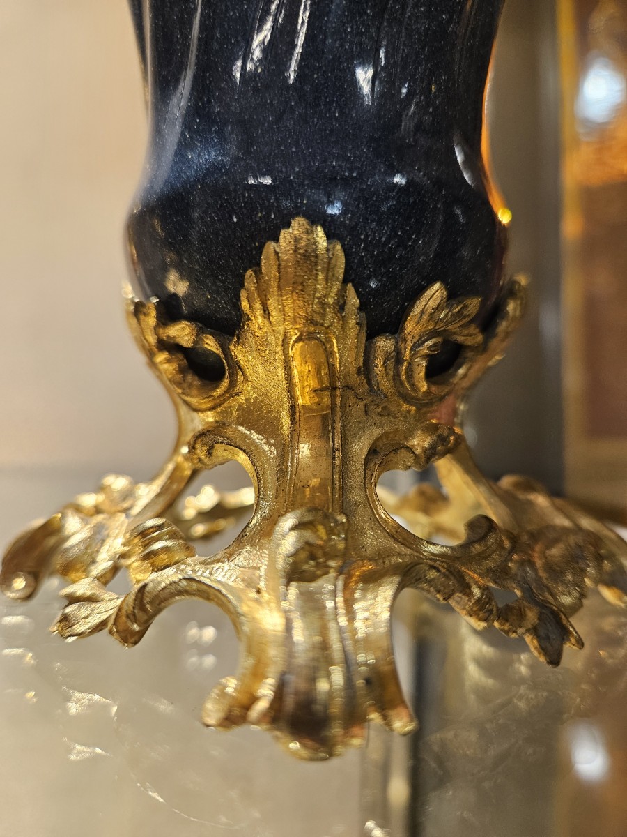 Le galbe harmonieux des vases, associé à la profondeur du bleu constellé de fines paillettes, crée un contraste somptueux avec la chaleur du bronze doré.