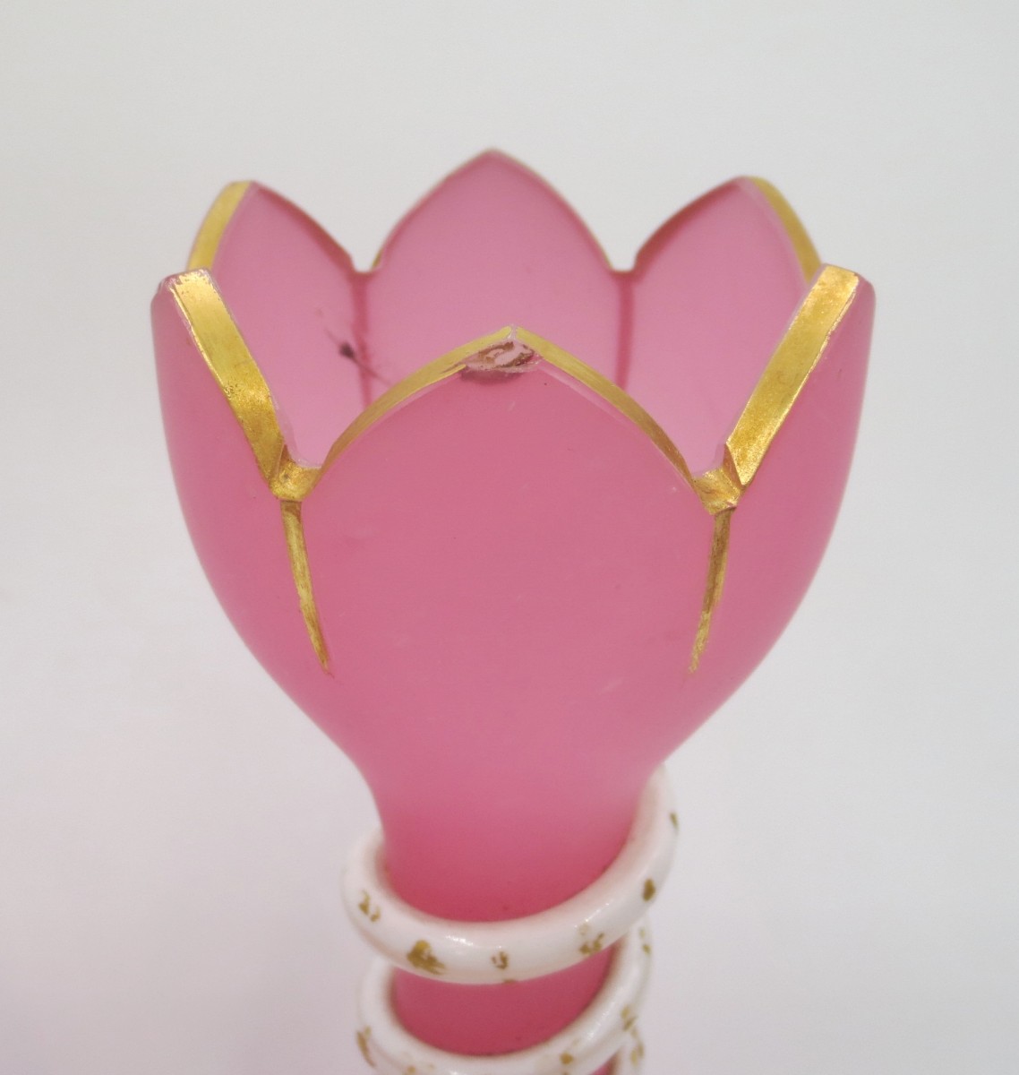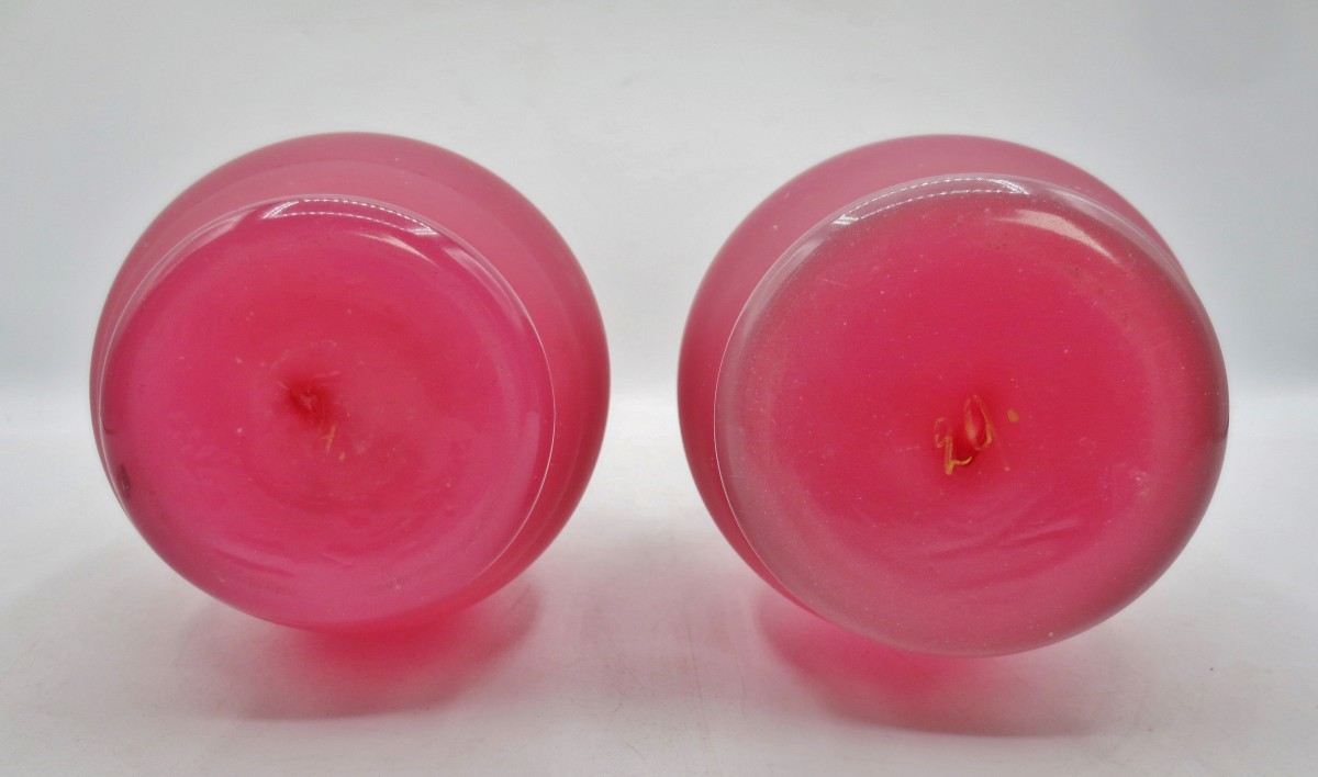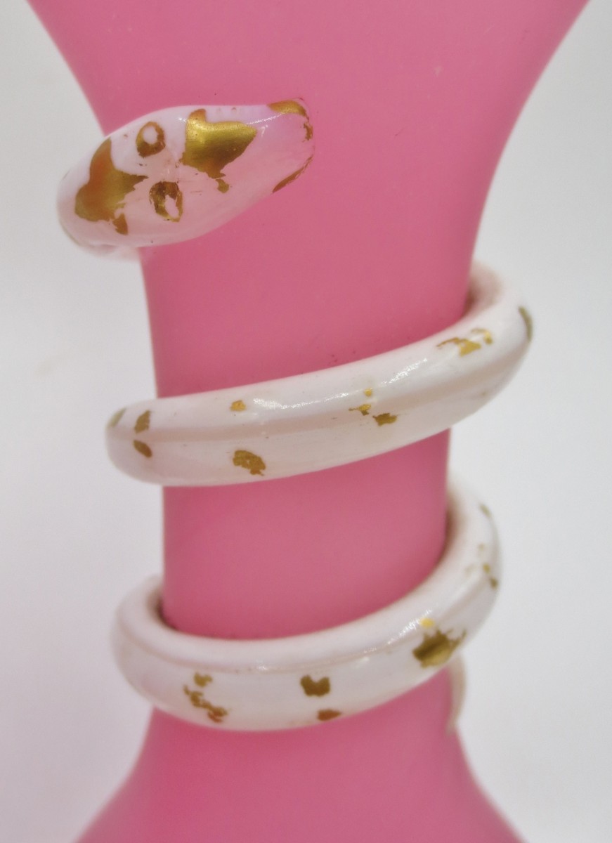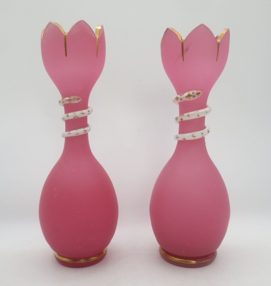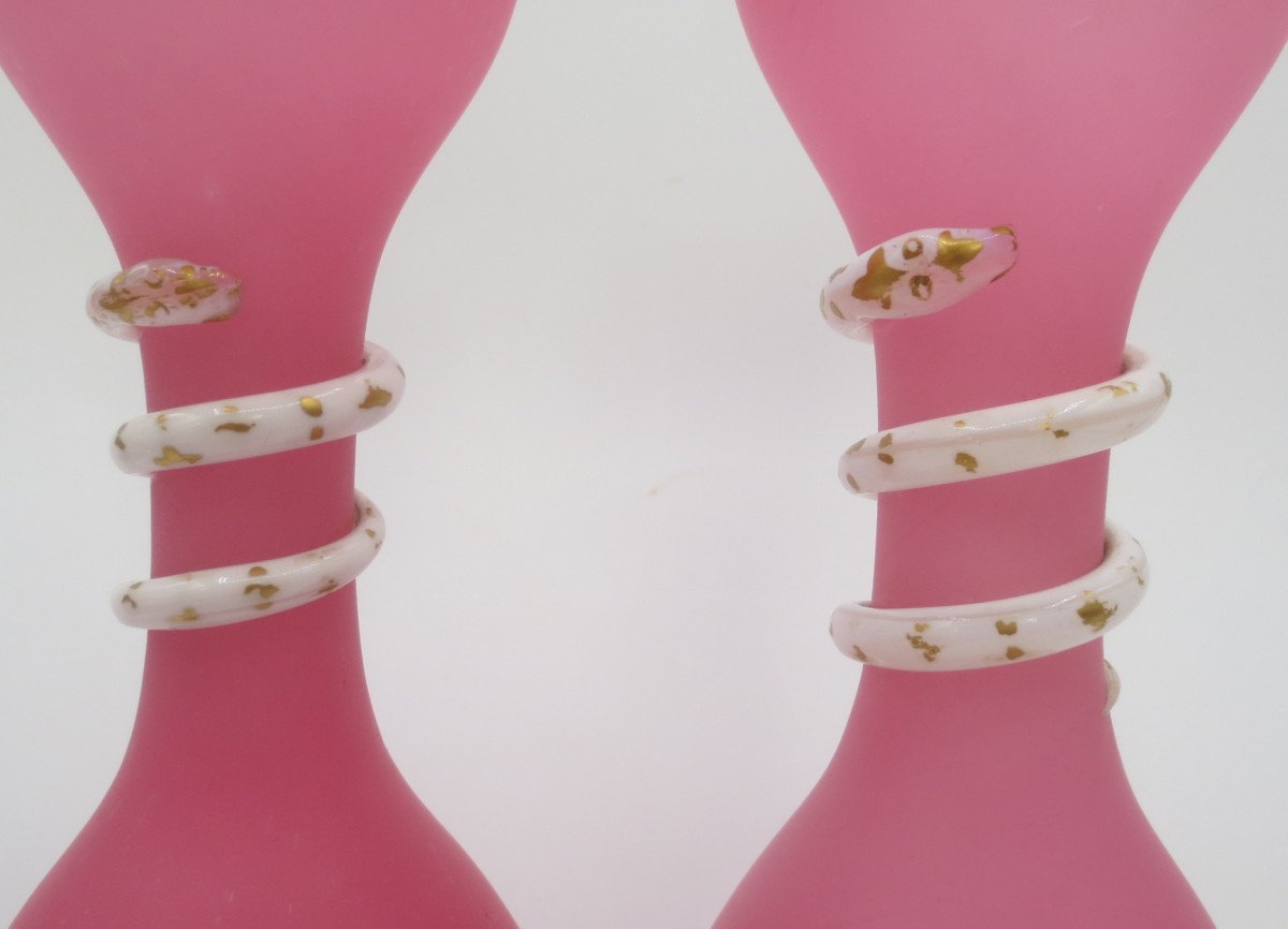 Ces vases en opaline rose ou hortensia sont ornés d'un serpent en blanc, les écailles peintes à la dorure, il vient s'enrouler, la tête en haut, autour du col. Le bord supérieur, largement évasé, est dentelé et souligné d'un filet doré. Leurs panses reposent sur une tore dorée. Cette couleur particulière et rare, recherchée des collectionneurs, est appelée gorge de pigeon ou hortensia, elle est obtenue grâce à l' adjonction de sel d'or à la pâte.