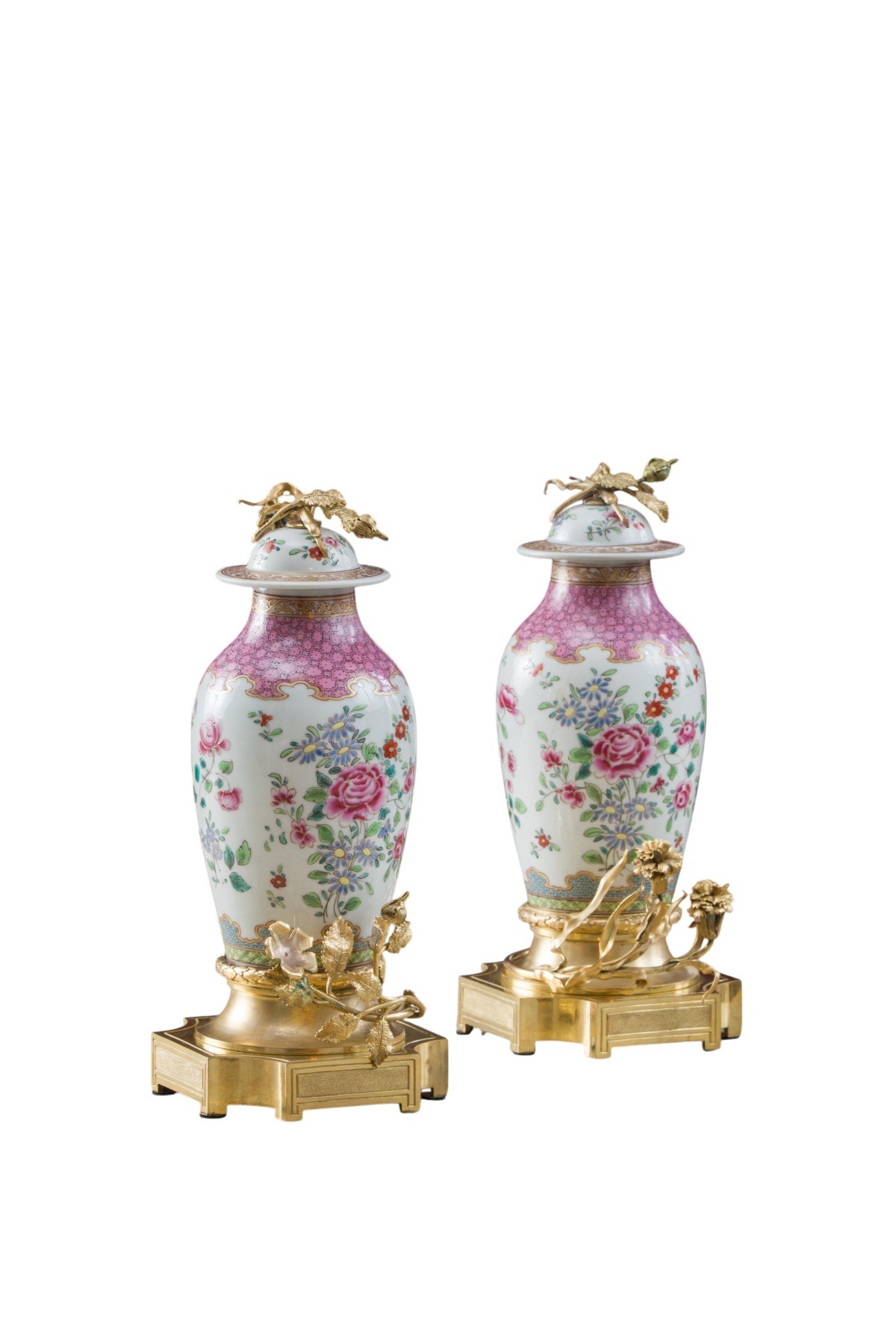 Paire de vases couverts de forme balustre en porcelaine fine à décor peint polychrome. Ils reposent sur une monture en bronze doré finement ciselé de forme cavet, surmontée de fleurs épanouies en relief.