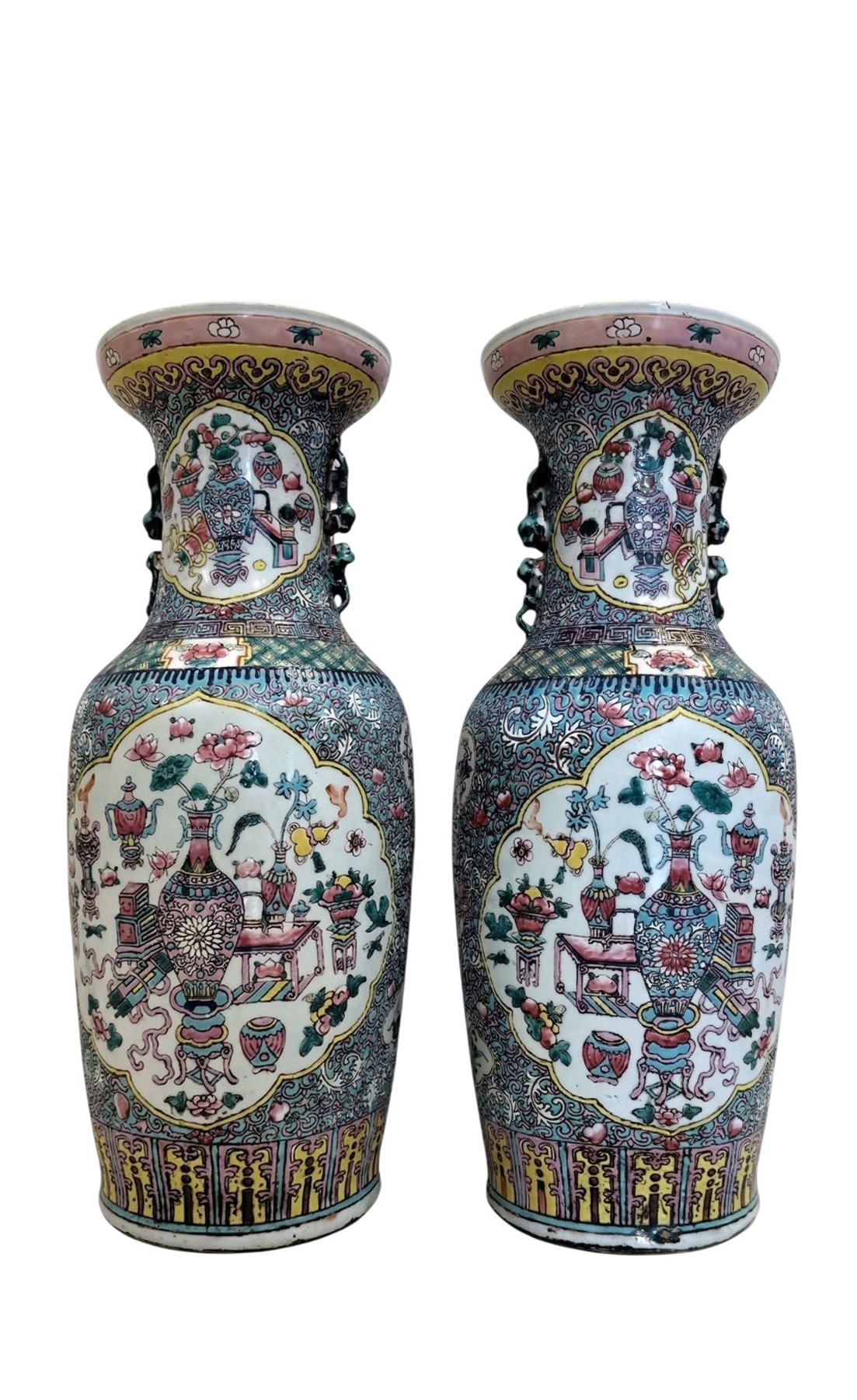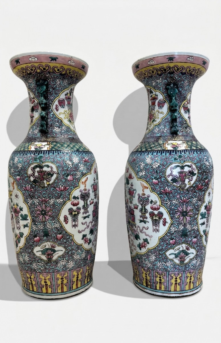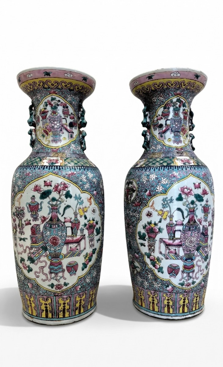 Paire de vases en porcelaine polychrome, Chine, XIXe siècle, à décor émaillé Famille Rose. Les réserves du corps et du col représentent des brûle-parfums, des vases à fleurs et divers objets, tandis que le fond est orné d'un dense feuillage. Petites anses zoomorphes et bords légèrement évasés, 60 cm.