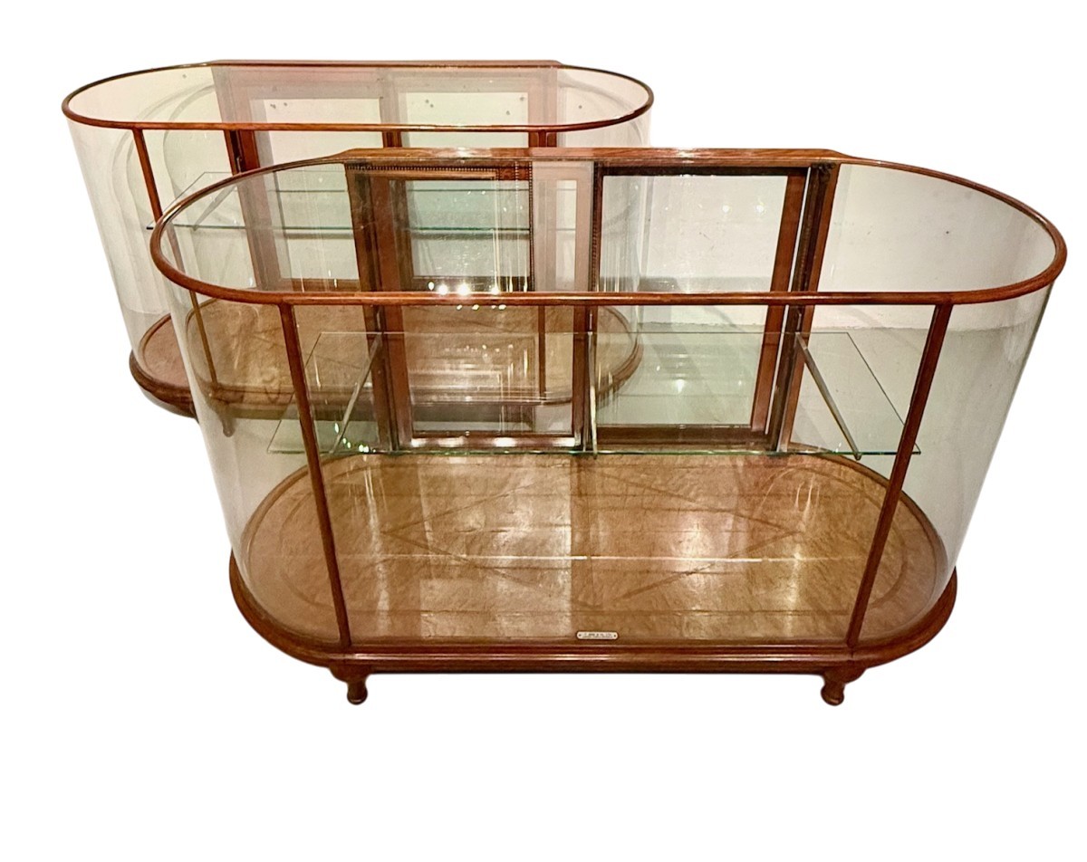 Les lignes architecturales épurées, les angles arrondis et les proportions équilibrées sont caractéristiques du style Art Déco. Chaque vitrine repose sur des pieds élégamment galbés et conserve ses étagères en verre.