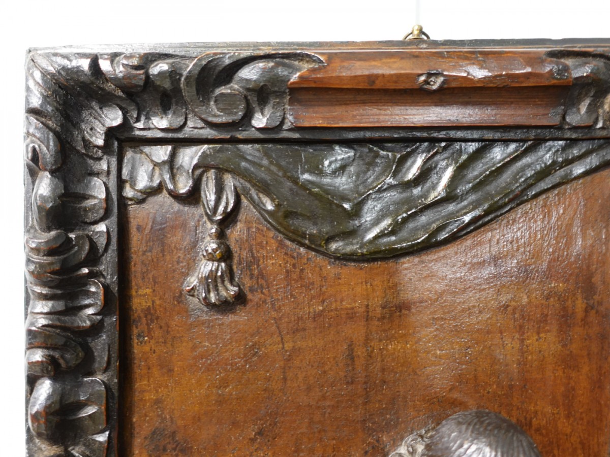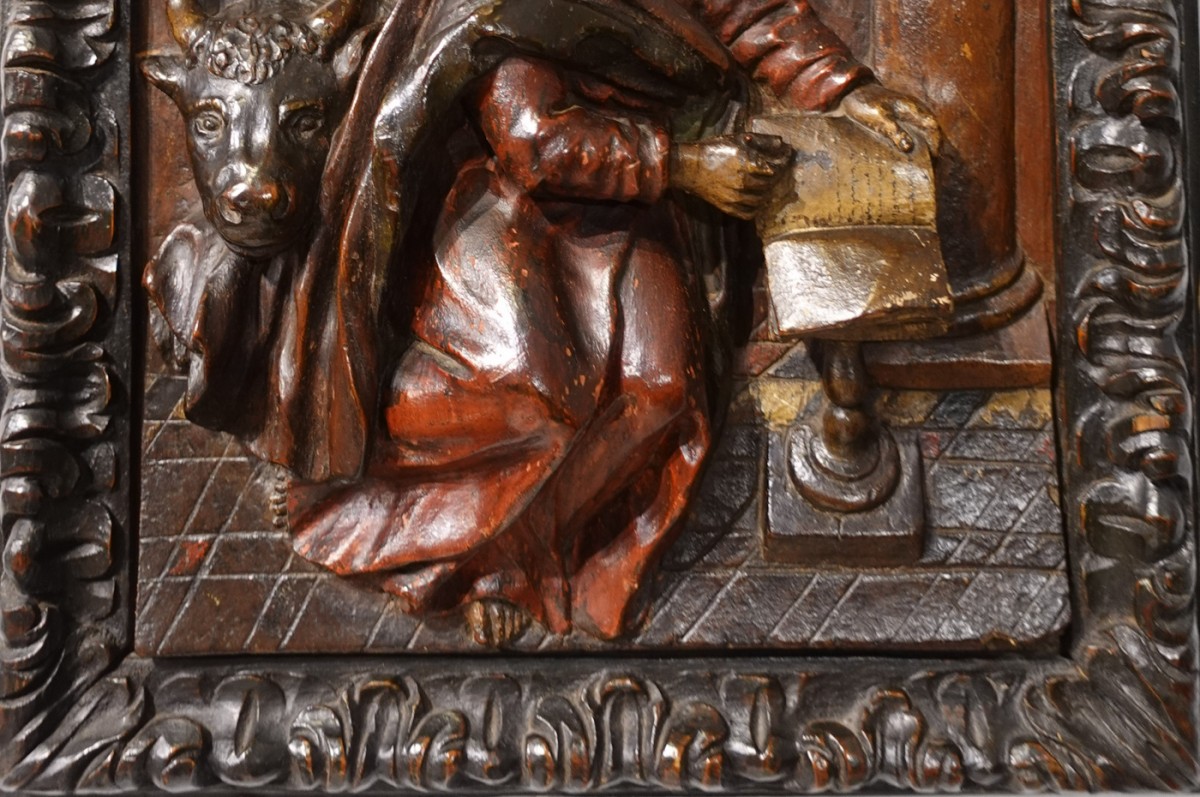 Ravissant panneau en noyer sculpté polychrome, dans son cadre d’origine, représentant Saint Luc, d’époque XVII°.