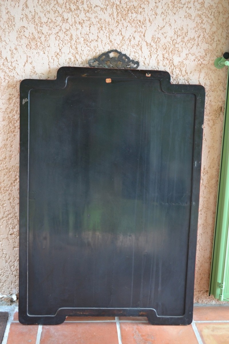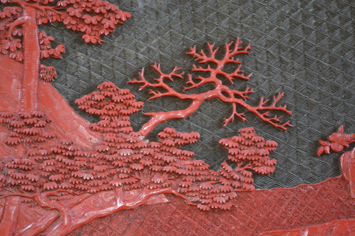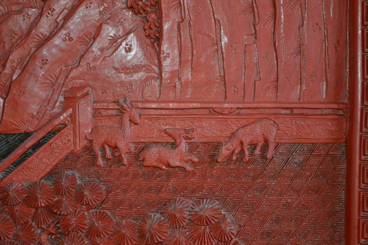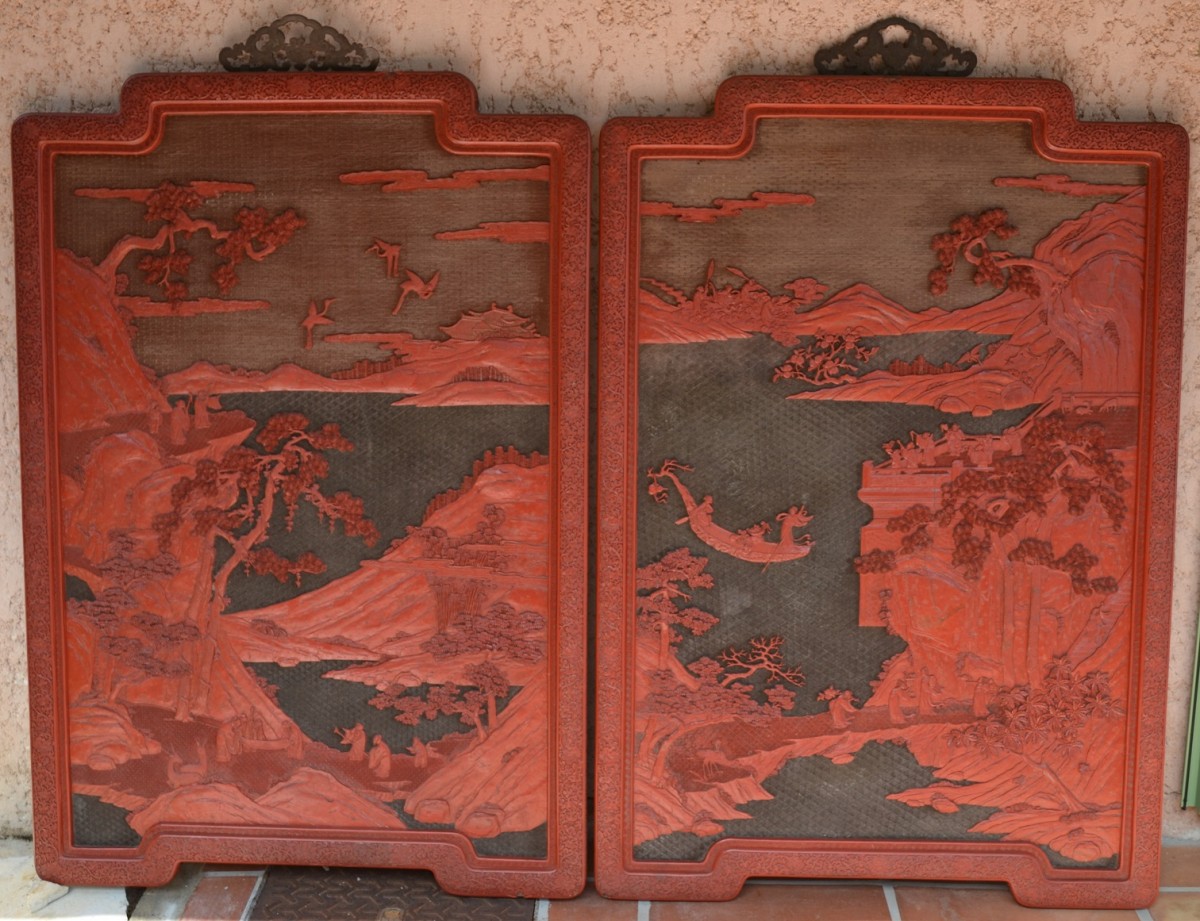 ... sulfure de mercure (cinabre). Le ciel et teinté couleur ocre et le lac couleur anthracite. Les sculptures sont très profondes ,ce qui implique une grande quantité de couches de laque comme une photo montre. Les suspensions sont d'origine, elles sont en bronze et représentent des volutes de dragons stylisés et de fleurs .Les panneaux de ce genre furent créés en petit nombre et s'il est rare d'en rencontrer un sur le marché de l'art il est exceptionnel d'en rencontrer une paire. C'est ce qui fait le grand intérêt muséal de ceux-ci.