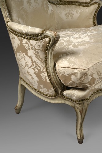 Retrouver le mobilier ou les objets d''art similaires à « Bergère Louis XV estampillée de G. JACOB » présenté par Galerie François Paul Belliard, antiquaire à Paris dans la catégorie Fauteuil & Bergère Louis XV, Sièges.