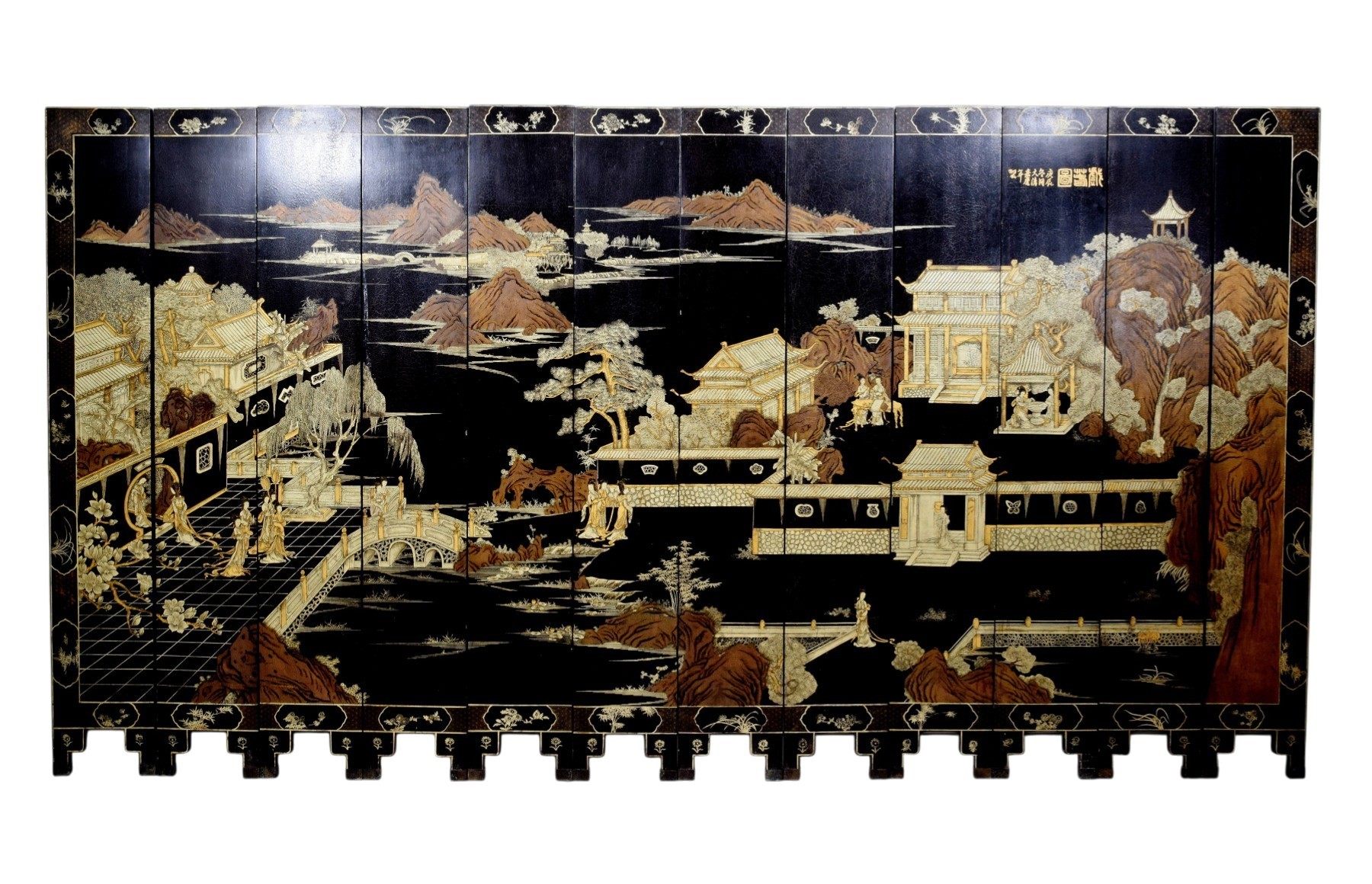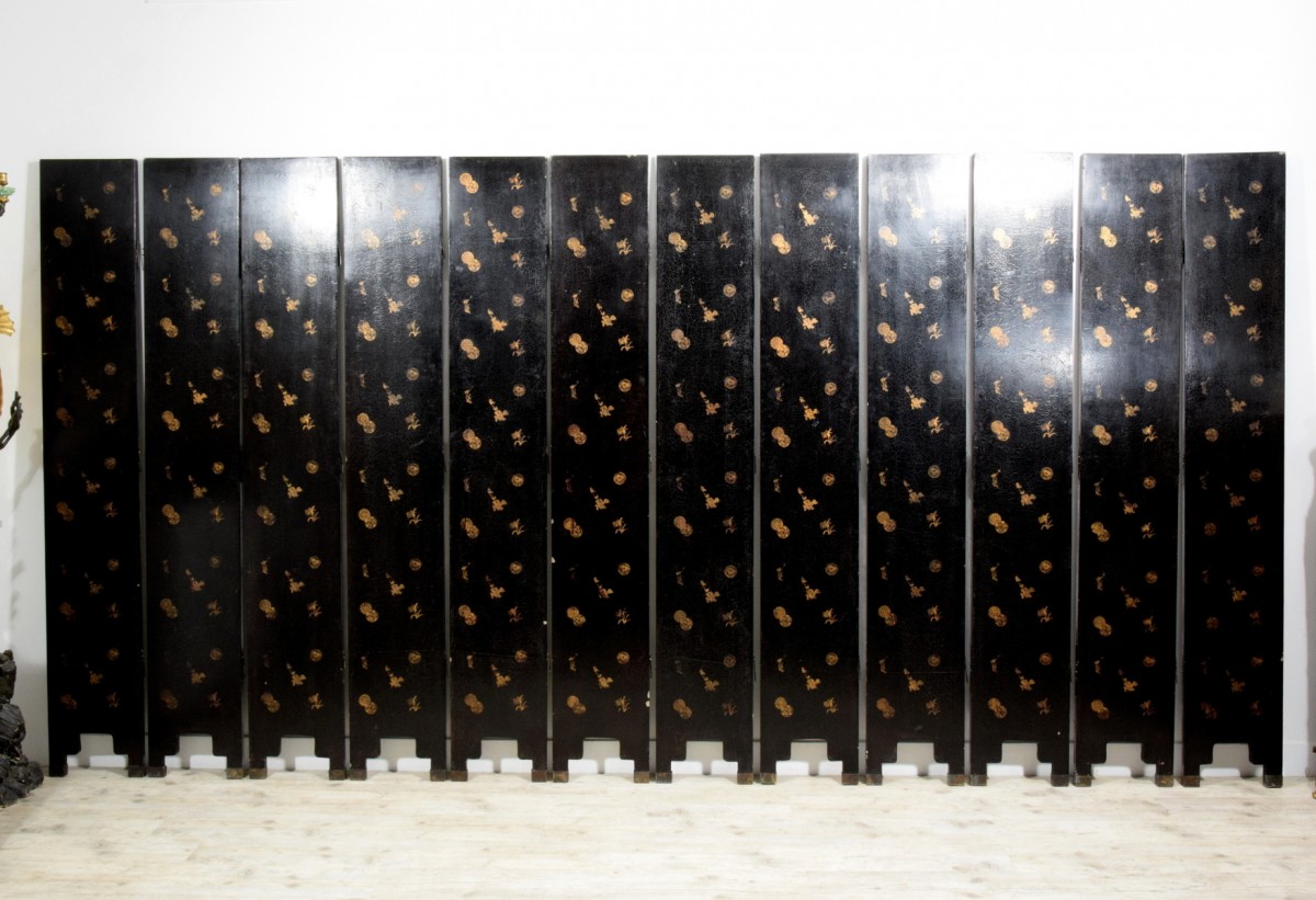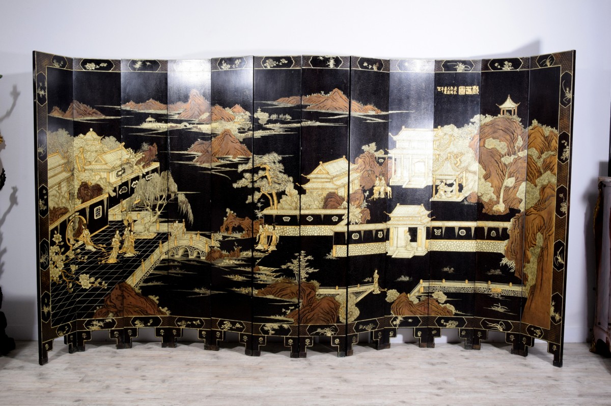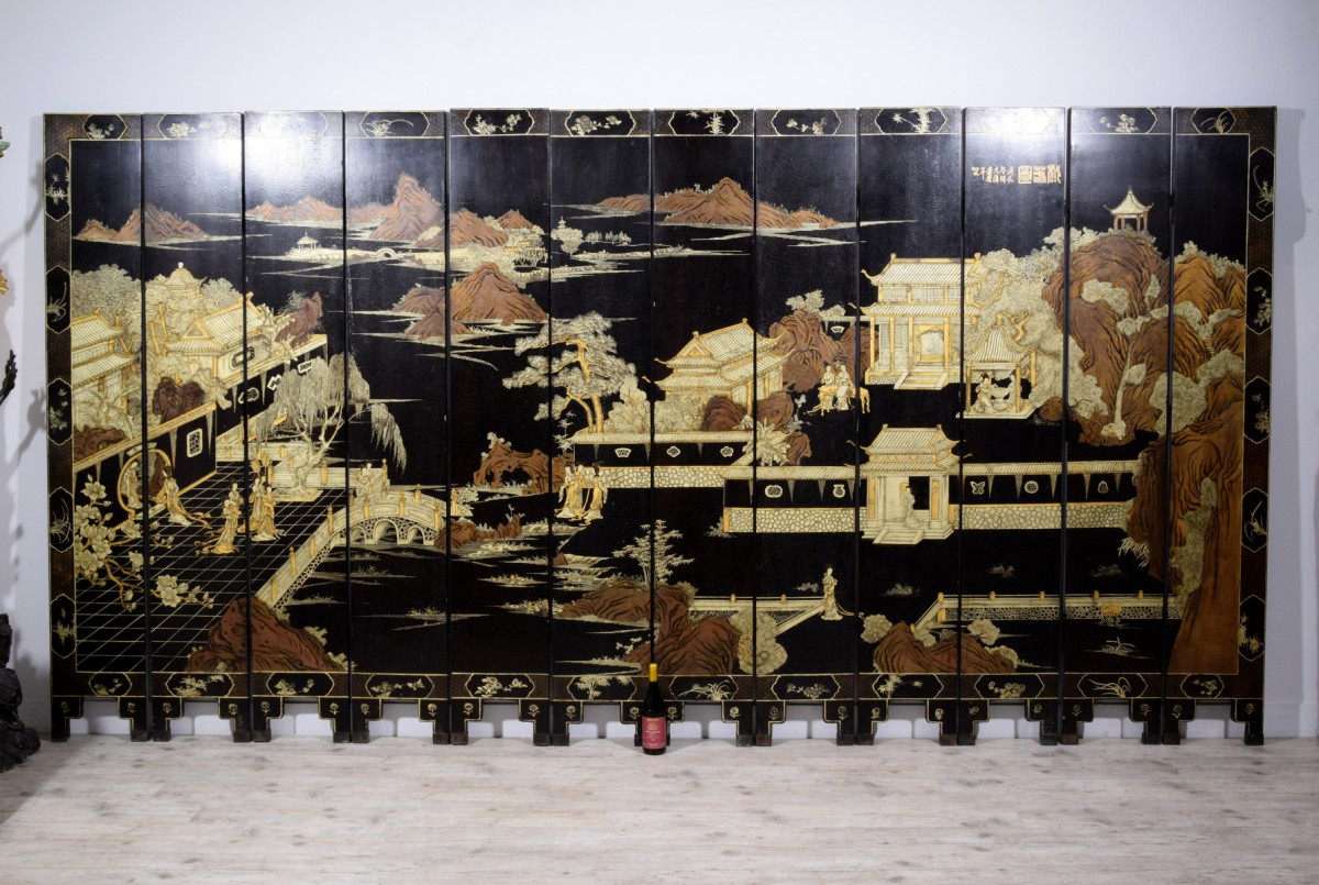 Paravent chinois du XIXe siècle à douze feuilles en bois laqué noir, d’une forte présence scénique, entièrement décoré à l’or représentant avec raffinement un palais impérial bordant l’eau. La surface frontale se déploie comme une grande peinture continue : à gauche, terrasses et pavillons aux toits recourbés, typiquement chinois, accueillent dames et dignitaires qui conversent et se promènent, reliés par des ponts arqués et des escaliers. Au centre, le paysage s’élargit en lacs, îlots, arbres et rochers, tandis qu’à l’arrière-plan se dessinent des chaînes de montagnes stylisées. À droite apparaissent d’autres bâtiments de représentation, de petits pavillons et l’un, plus imposant et surélevé, domine la scène et crée un effet de profondeur théâtrale.