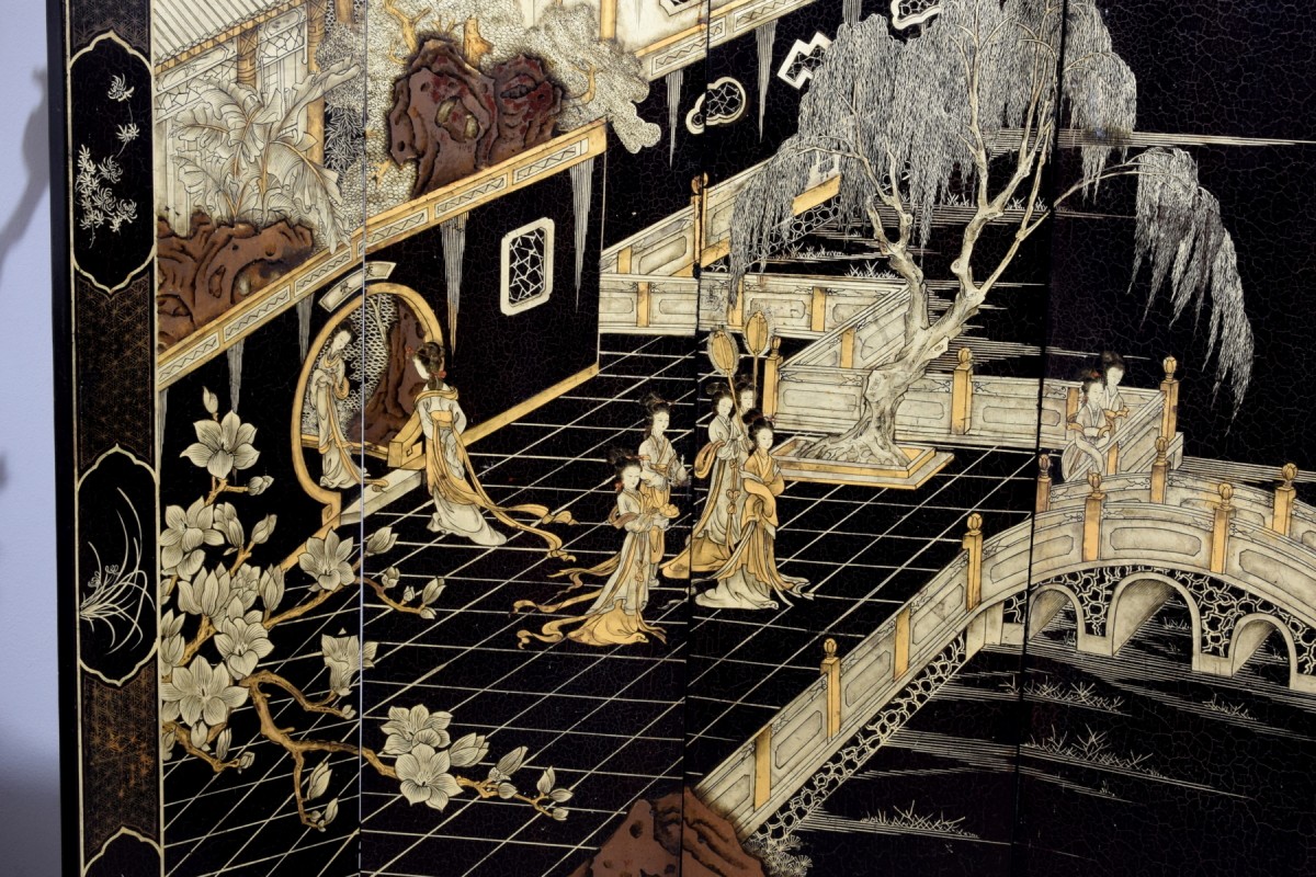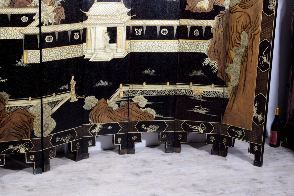 Le revers des panneaux, laqué noir et orné de motifs floraux et de médaillons dorés, permet une utilisation des deux faces lorsque le paravent est placé au centre d’une pièce. Les panneaux sont articulés par des charnières qui facilitent leur ouverture et leur pliage partiel : le paravent peut ainsi servir à délimiter des espaces intimes dans un salon, une chambre ou un bureau, ou bien comme grand panneau décoratif adossé à un mur, tel un vaste tableau. L’effet d’ensemble est celui d’un paysage lumineux, capable de transformer tout intérieur en un décor raffiné et élégant. Adapté aussi bien aux environnements anciens que contemporains, le contraste chromatique et les sujets orientaux rendent ce paravent d’une grande polyvalence.