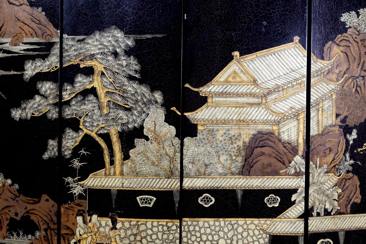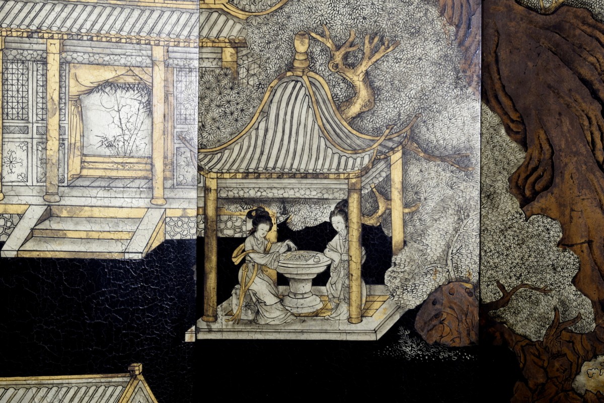 La décoration alterne l’or et des tons plus chauds bruns dorés, avec des détails gravés dans la laque soulignant tuiles, balustrades, feuillages et vêtements des personnages. ...