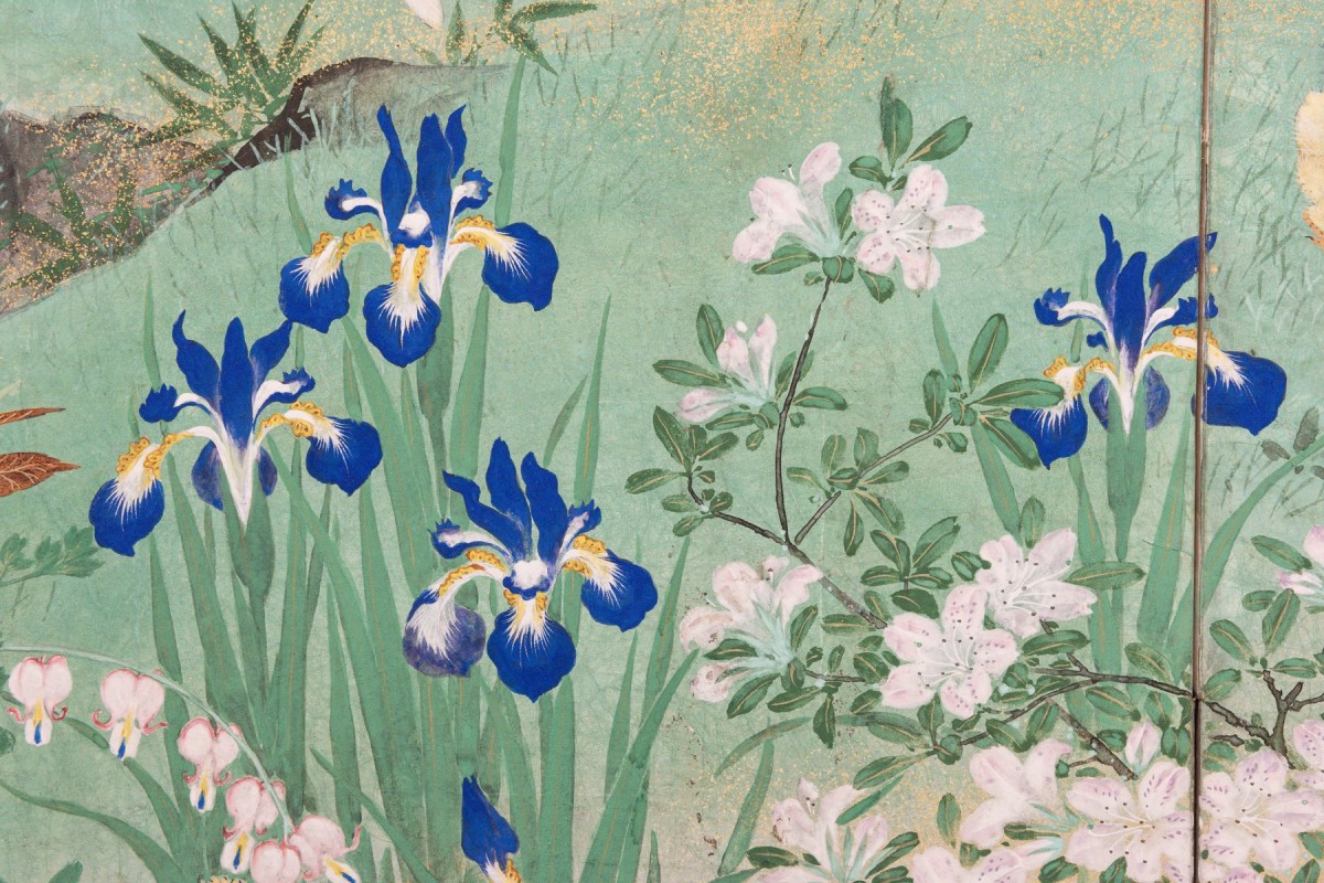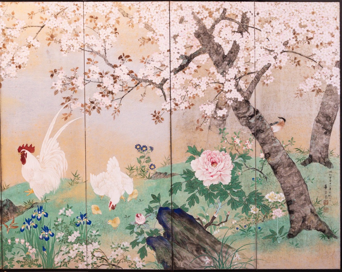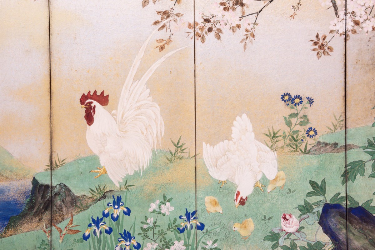 Paravent particulier à huit panneaux sur fond en feuille d’argent avec nuages dorés, représentant une scène de printemps avec un coq, une poule et des poussins sous un cerisier en fleurs. La scène est complétée par un cours d’eau serpentant parmi des rochers et de la végétation sur le côté gauche. Le fond en feuille d’argent, légèrement patiné, est enrichi de nuages dorés qui créent un effet lumineux et uniforme.