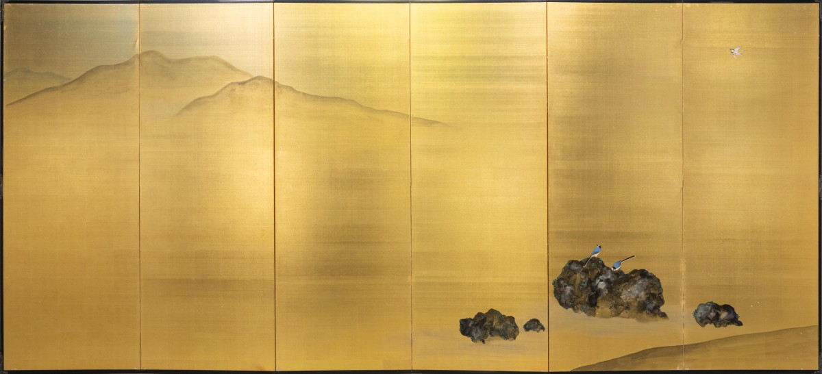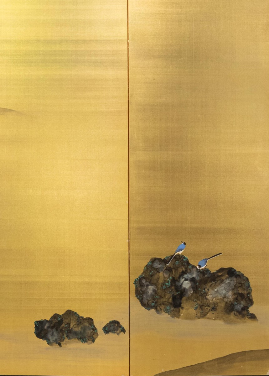 Paravent à six panneaux en soie dorée représentant deux pies bleues posées sur des rochers affleurant le long de la rive d’un cours d’eau.