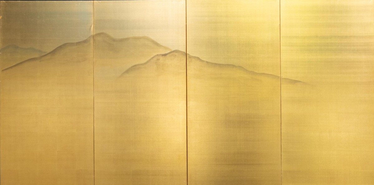 La composition est épurée, avec des montagnes à peine suggérées à l’horizon par des profils estompés, tandis que les rochers et les figures des oiseaux, rendus avec une intensité chromatique plus marquée, créent un point focal sur la partie droite du paravent.
