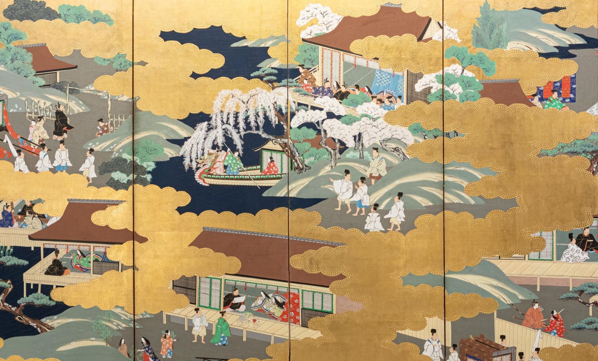 Paravent à six panneaux peint sur papier avec pigments et feuille d’or, représentant des épisodes tirés du Genji Monogatari. La composition se développe à travers différentes scènes narratives situées dans d’élégantes architectures de cour et des paysages printaniers, avec des figures engagées dans des moments de vie aristocratique et des activités quotidiennes. Les nuages dorés, réalisés en feuille d’or légèrement en relief, structurent l’espace et relient les différentes scènes, créant un rythme visuel continu. Cadre en bois laqué avec bordures en soie.