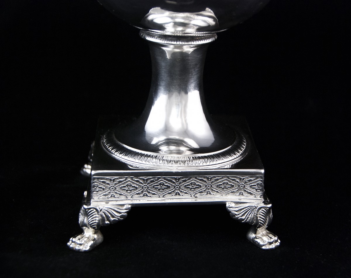Important drageoir en argent massif et cristal, de forme Médicis. Il repose sur un piédouche circulaire bordé d'une frise de godrons et d'une frise de feuilles d'eau, la base carrée comportant quatre pieds griffe à palmettes et acanthes, les bordures ornées d'une frise de quartefeuilles sur fond amati.