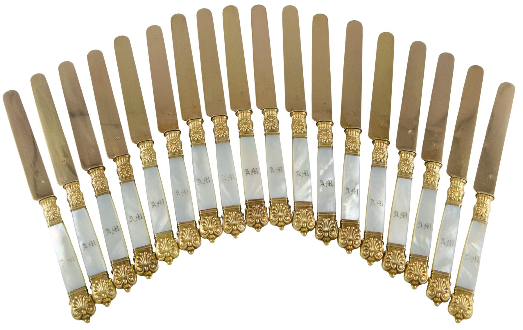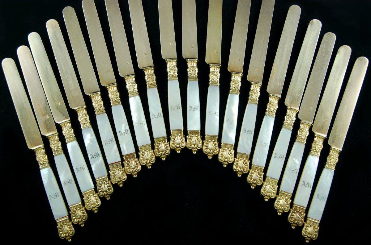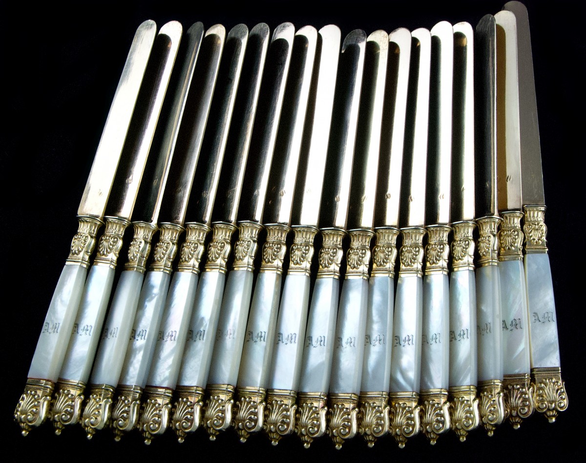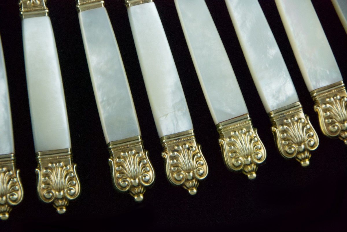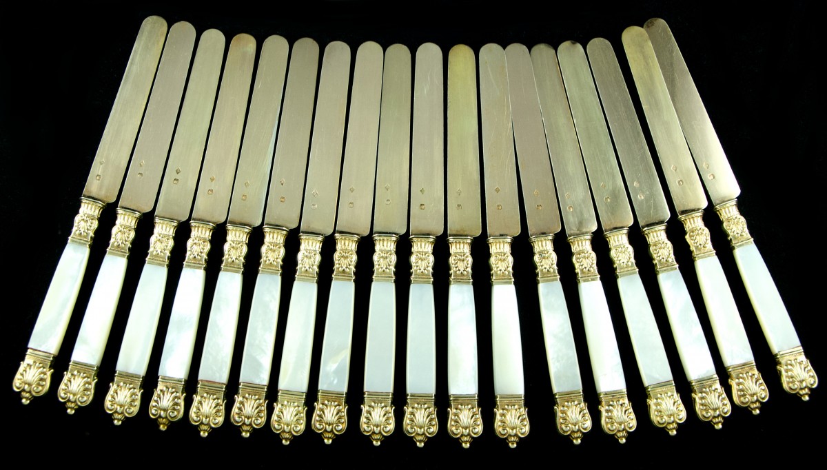 Superbe suite de dix-huit couteaux dits "à fruits" en nacre et vermeil.