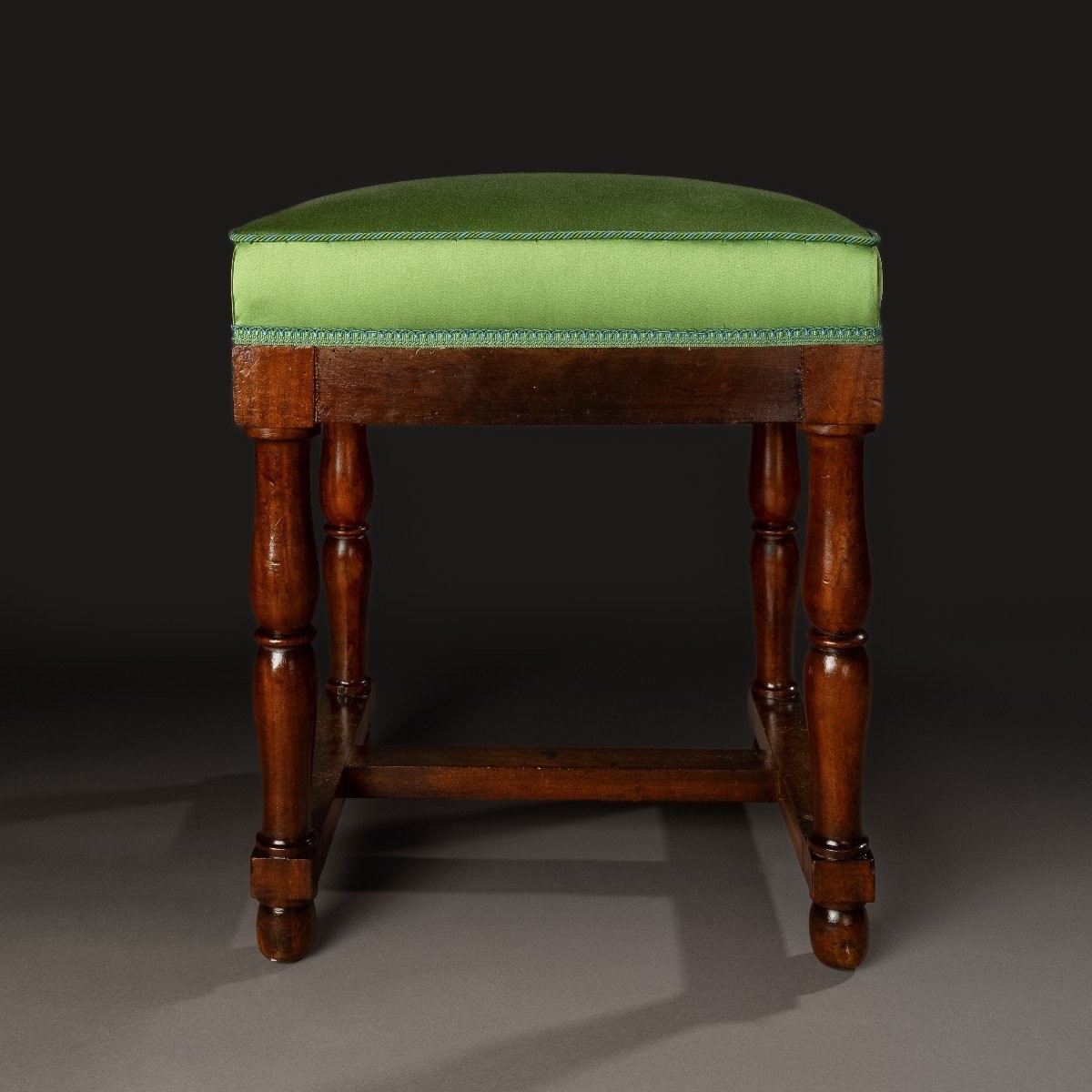 Grand et haut tabouret du début du XIXe siècle. Il repose sur des pieds boules. Entretoise en H reliant les quatre pieds à double balustres baguées.
