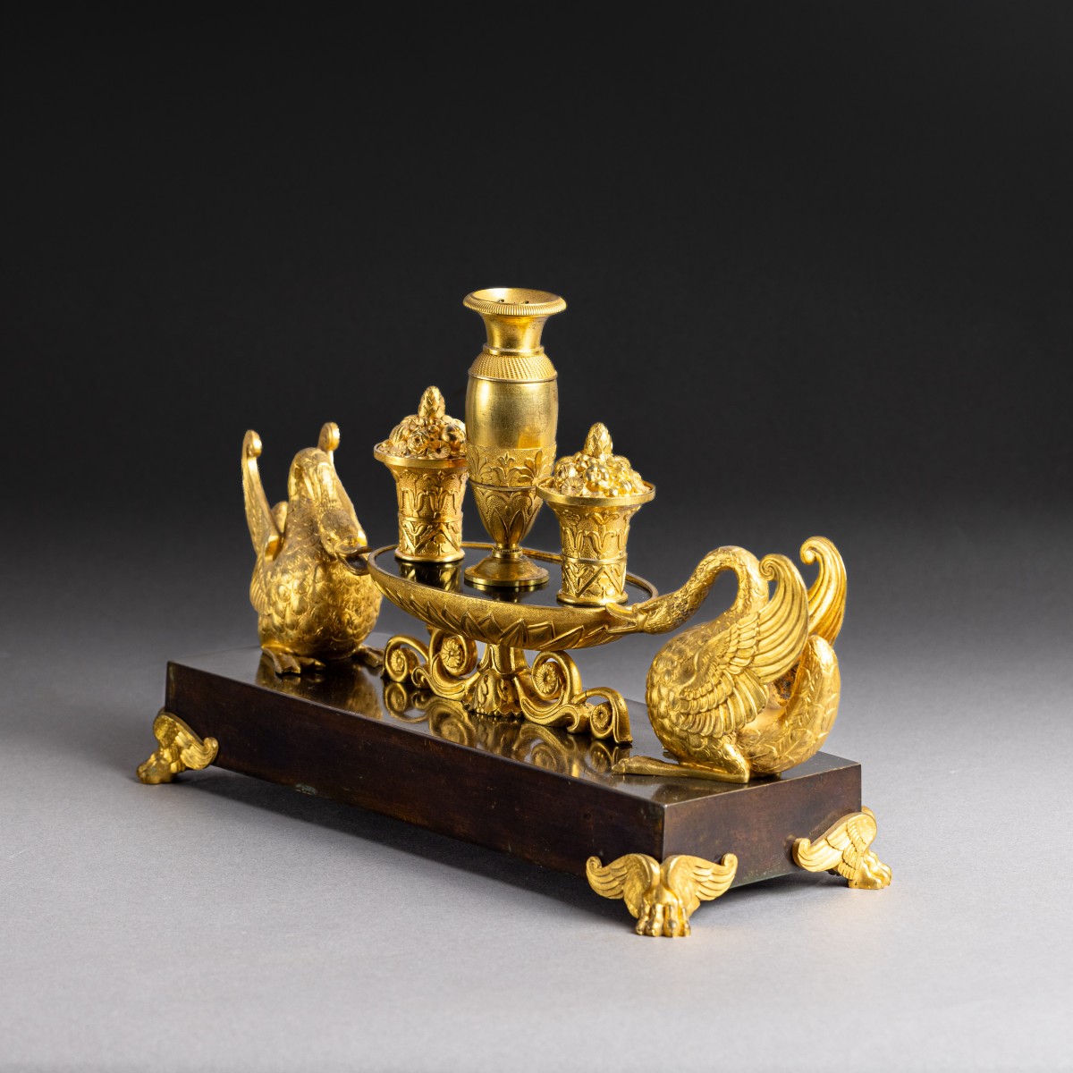 Important encrier formant porte-plume, reposant sur quatre pattes de lions. Le corps, de forme rectangulaire, ouvre par un tiroir en façade possédant un riche décor de cygnes et d'arabesques sur fond à semi de mat. Deux cygnes affrontés reposent sur le dessus et encadrent les binets - et les couvercles amovibles - servant à recevoir l'encre ainsi qu'un brûle-parfum.