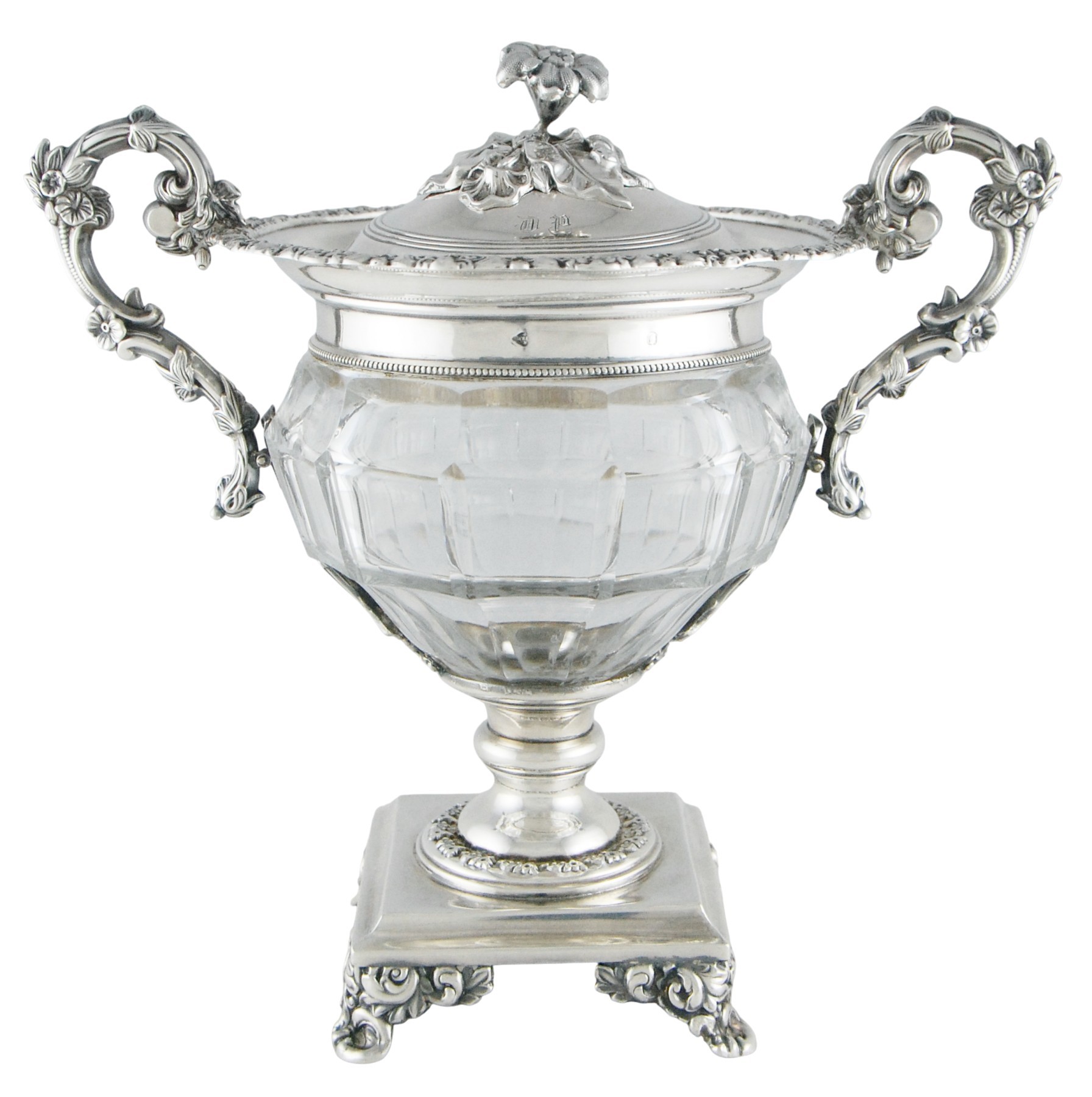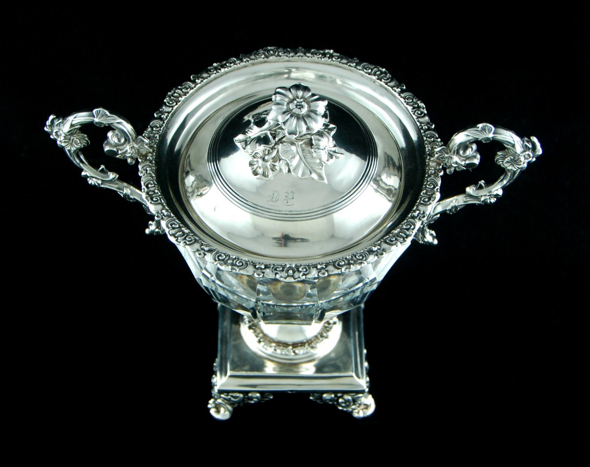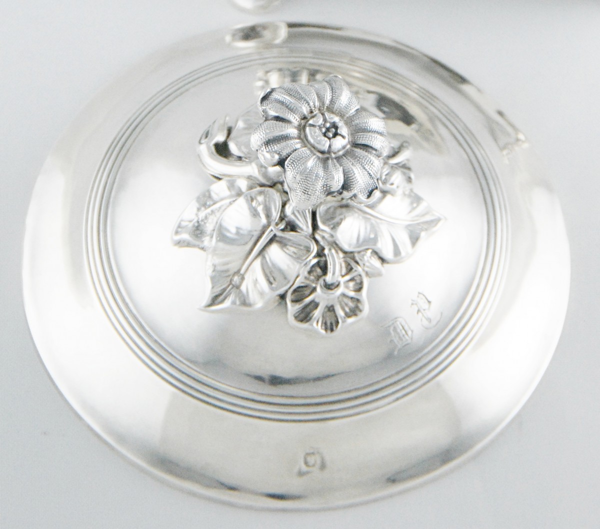 Le drageoir est sommé d’un couvercle dont la prise est formée d’une fleur au naturel, reposant sur une terrasse de fleurs et feuillages. Le couvercle est orné du monogramme DP gravé en lettres gothiques.