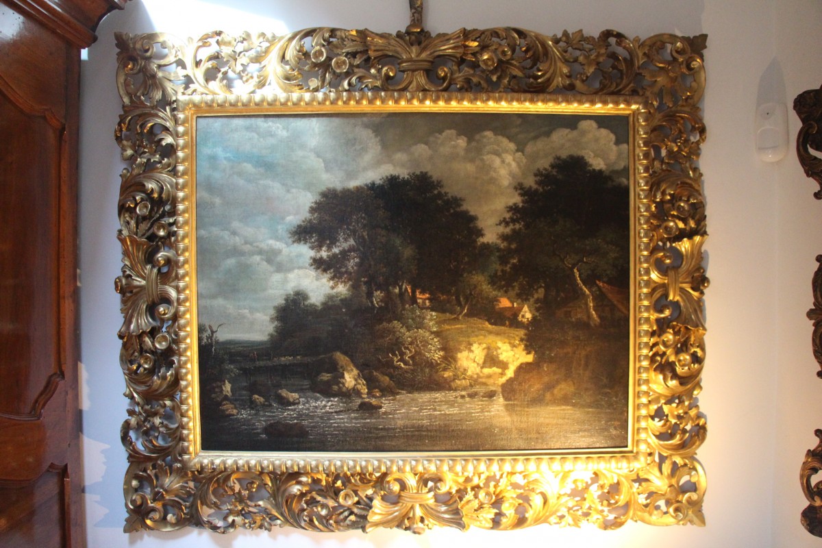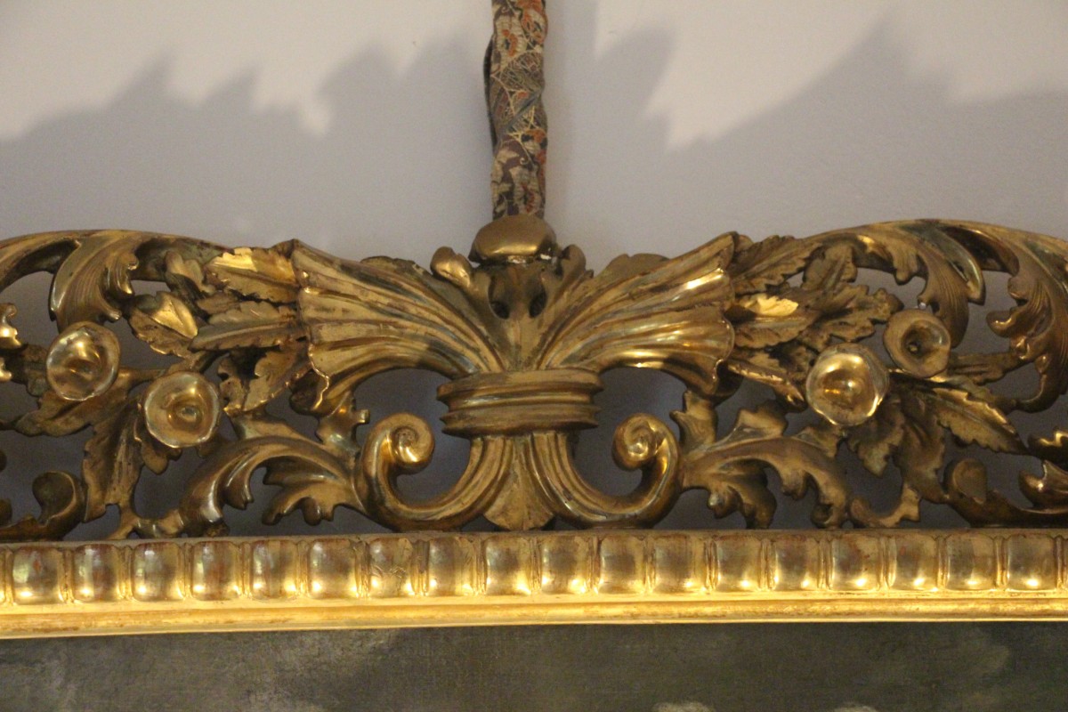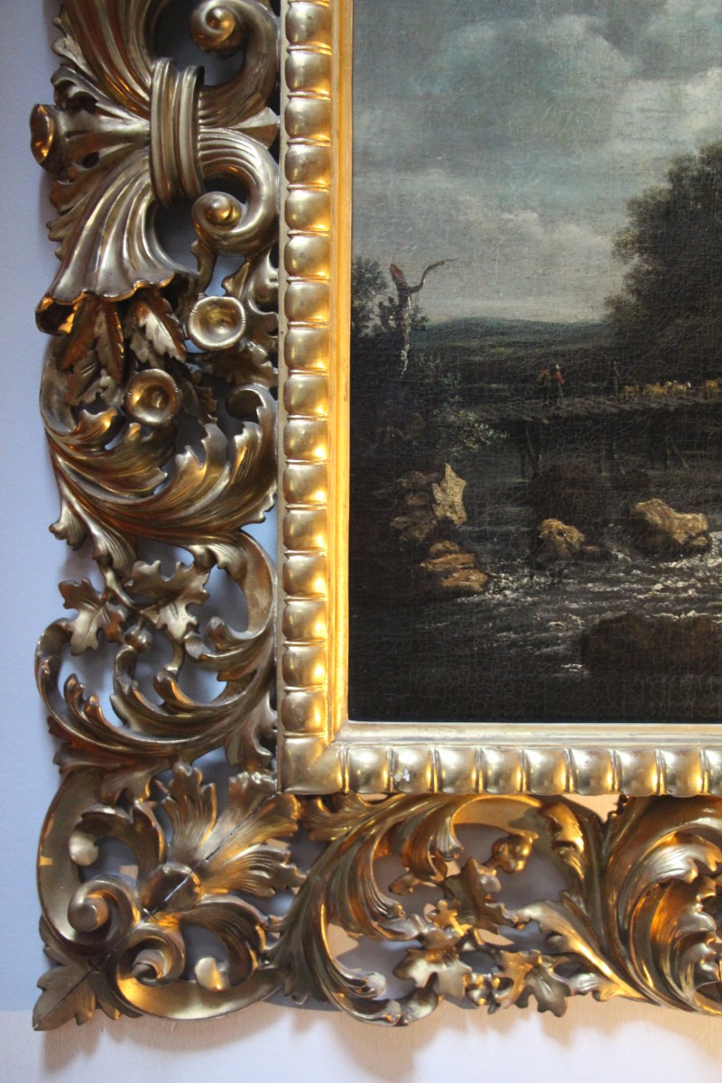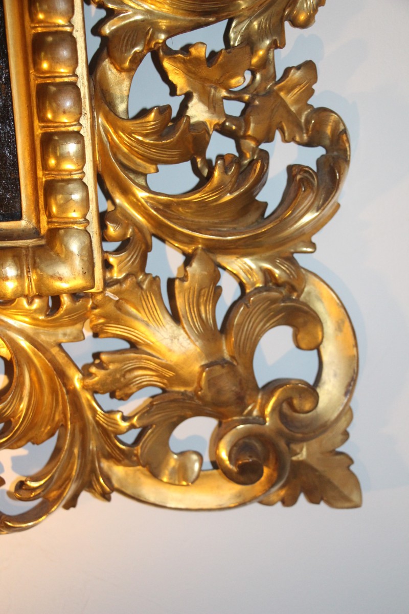 Un somptueux cadre en bois sculpté décoré de feuilles d'acanthes, de fleurs de volutes et de feuillages en complète le décor.
