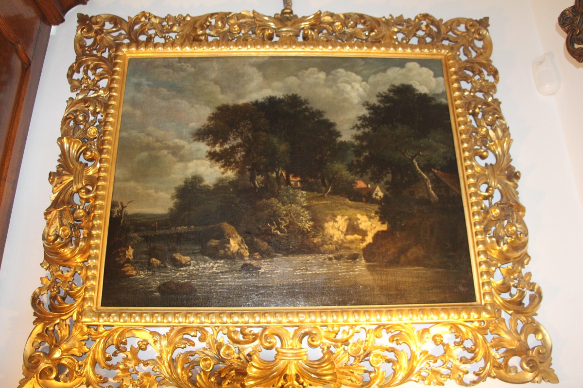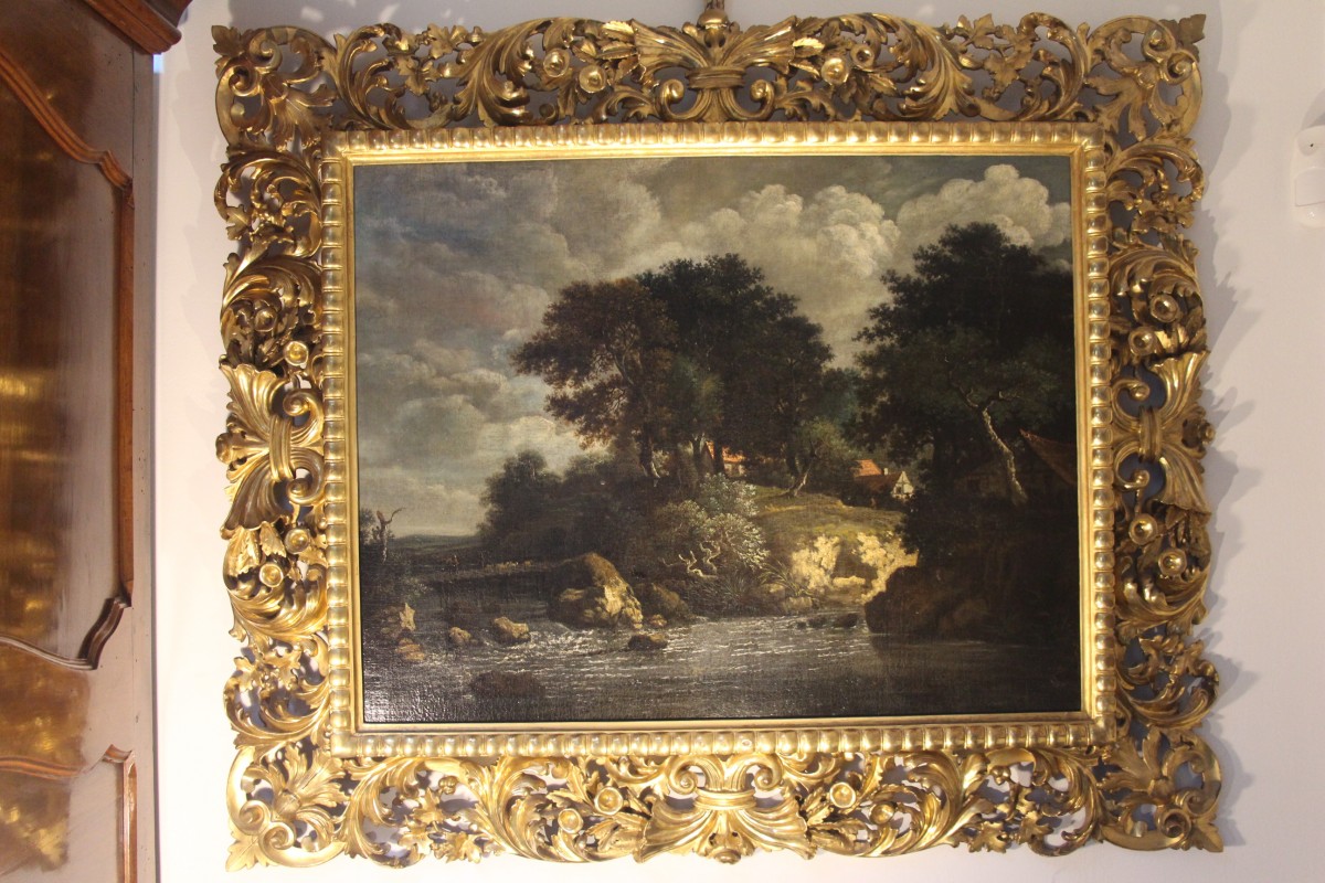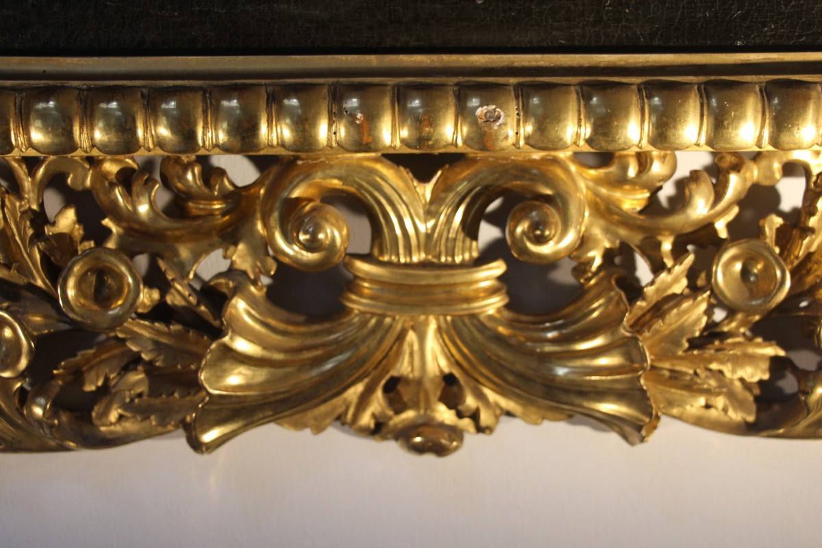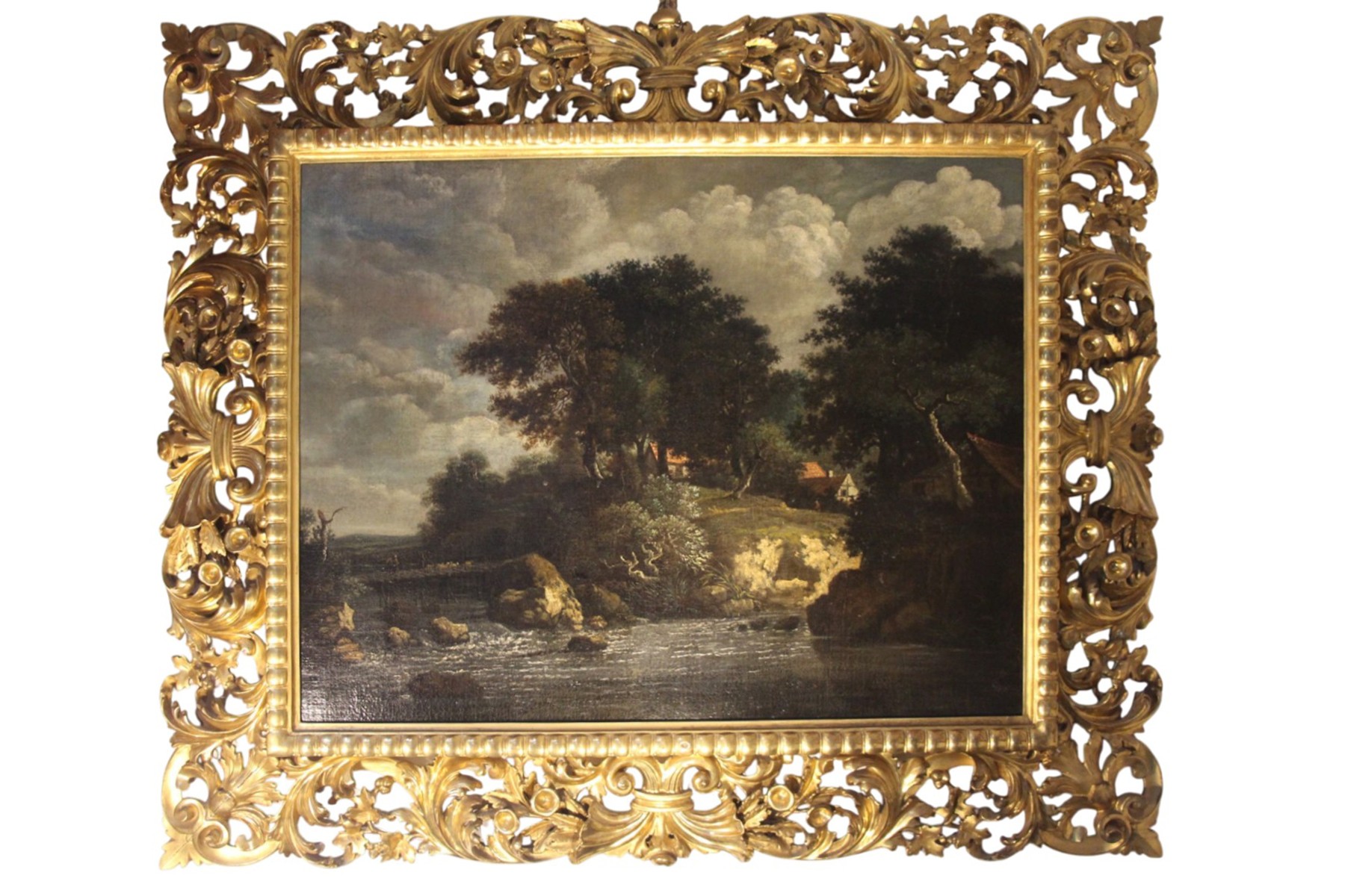 Un somptueux cadre en bois sculpté décoré de feuilles d'acanthes, de fleurs de volutes et de feuillages en complète le décor.