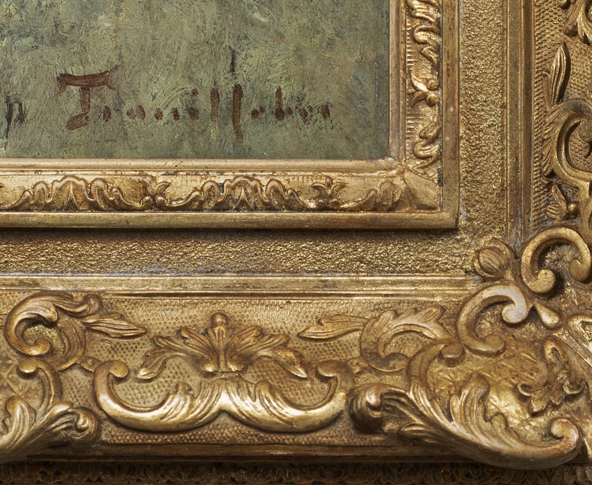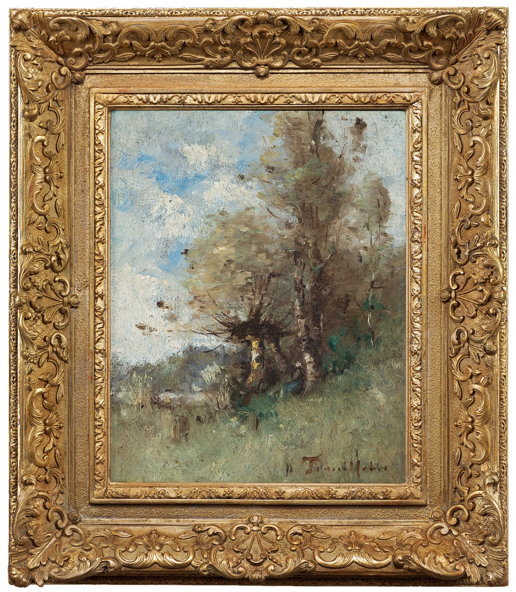 Paul-Désiré Trouillebert est né en 1829 à Paris. En France, il est l’un des meilleurs paysagistes de plein air du XIXème siècle, et sans doute l’artiste le plus proche de Corot avec qui il noua de fortes relations. La touche de Trouillebert, enlevée et légère, lui permet de jouer avec les transparences ; sa palette essentiellement composée de bleus, verts et bruns, a une tonalité toute particulière grâce à la préparation ocre que Trouillebert posait sur ses toiles et panneaux avant de peindre, et qui constitue comme sa seconde signature. A l’instar de Corot, il déclarait « Je ne travaille que d’après nature, je n’admets pas l’étude recopiée dans l’atelier. »