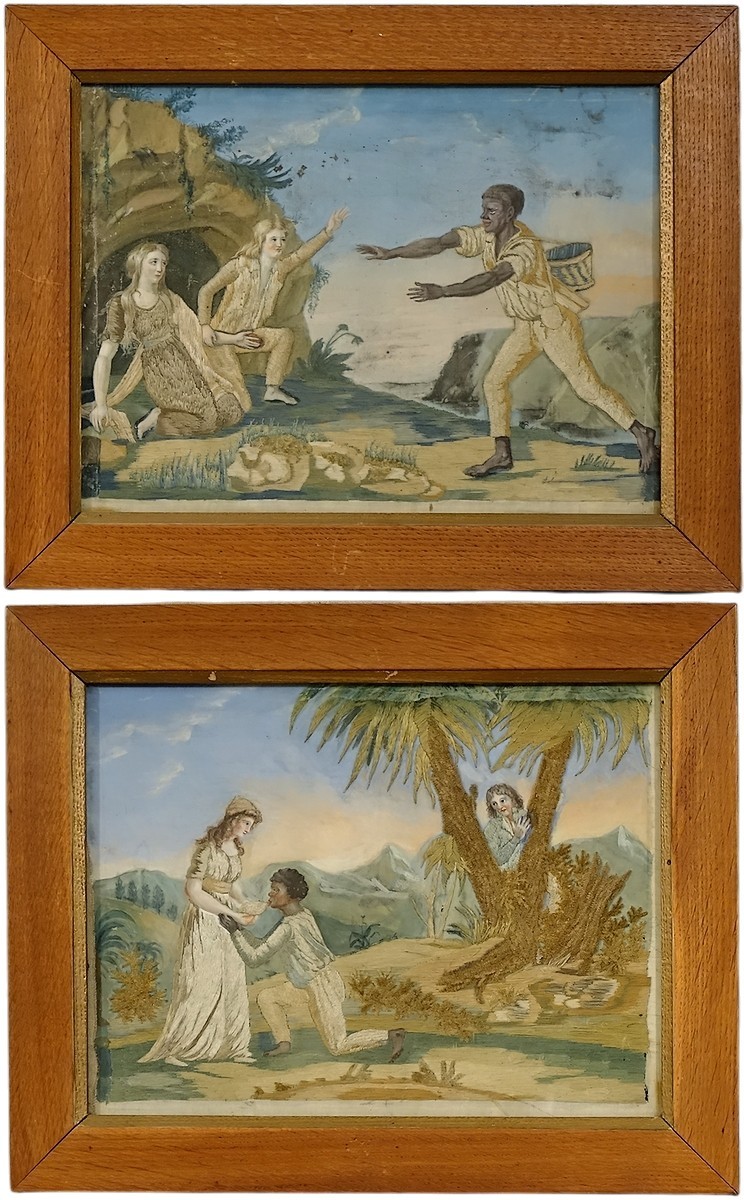 Rare et très charmante paire de peintures sur soie rehaussées de broderies de fils de soie, à sujet de deux épisodes tirés du roman de Jacques-Henri Bernardin de Saint-Pierre édité en 1788 et 1789, Paul et Virginie.