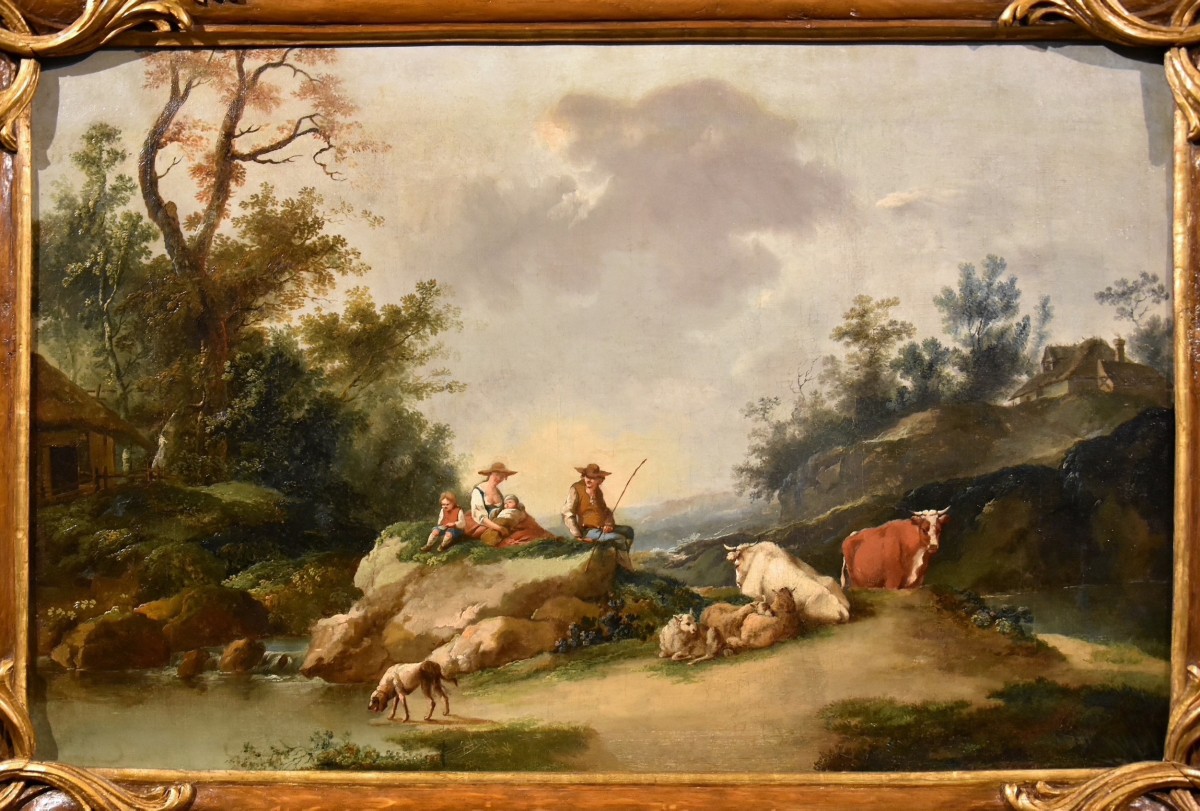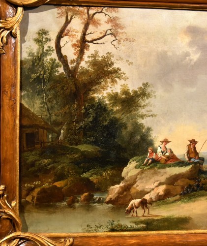 Retrouver le mobilier ou les objets d''art similaires à « Paysage avec rivière et bergers- École kitalienne du 18e siècle » présenté par Antichità Castelbarco, antiquaire à Riva del Garda dans la catégorie Tableaux XVIIIe siècle Louis XV, Tableaux et dessins.