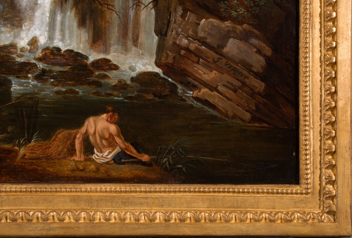 Dans un climat plus paisible, notre tableau met ainsi en scène des pêcheurs au premier plan tandis que l’arrière-plan se situe à Tivoli devant la grande cascade et se découpant dans le ciel, une architecture antique.