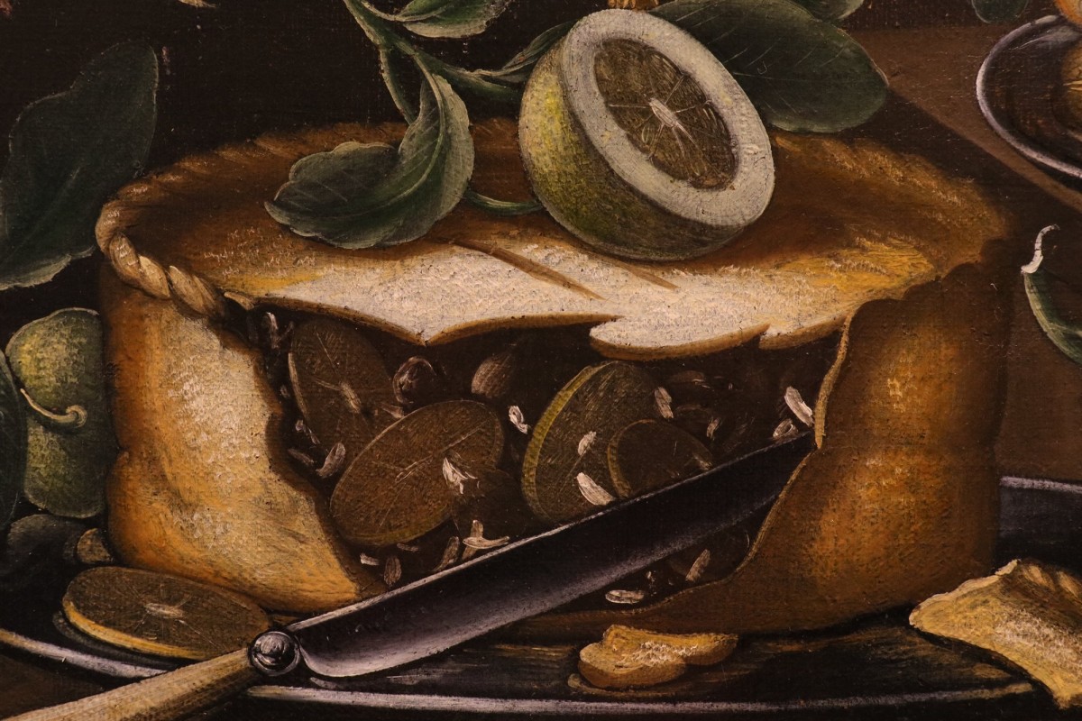 Chaque élément est rendu avec un réalisme extraordinaire : la texture friable de la croûte du gâteau, l’éclat du métal, la surface lisse et cireuse des citrons et des pommes, la porosité du grand morceau de fromage affiné et les coques entrelacées des noix éparpillées sur la table.