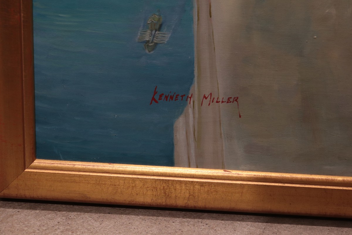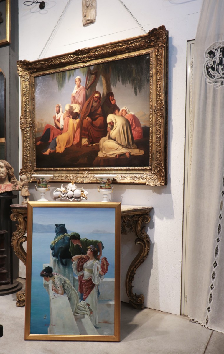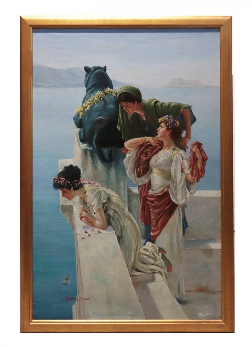 Peinture Scène galante, XXe siècle Magnifique peinture à l'huile sur toile représentant une scène galante. (inspirée d'un célèbre tableau du peintre Lawrence Alma-Tadema) Dimensions avec cadre : 105 x 70 cm Signée en bas à gauche Kenneth Miller