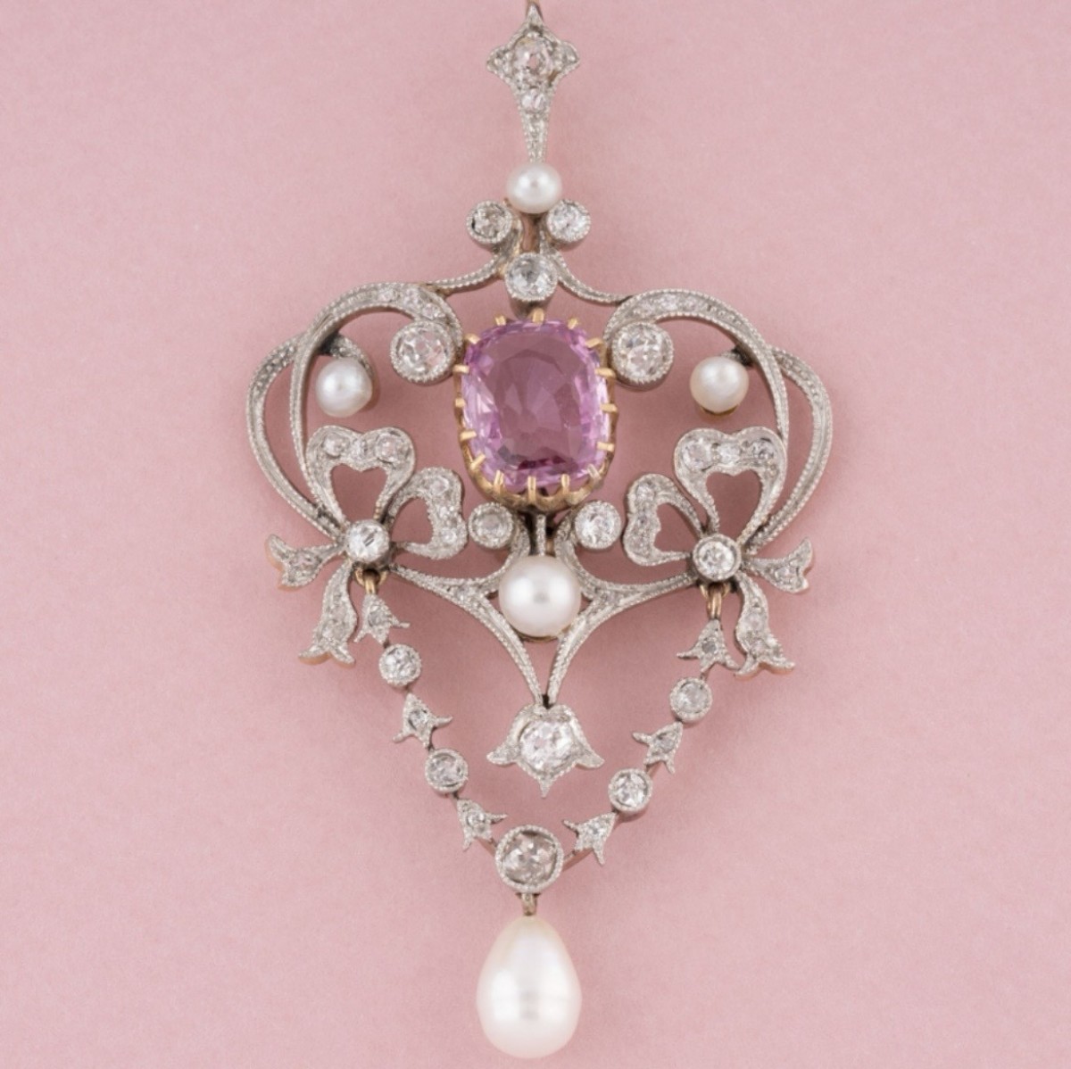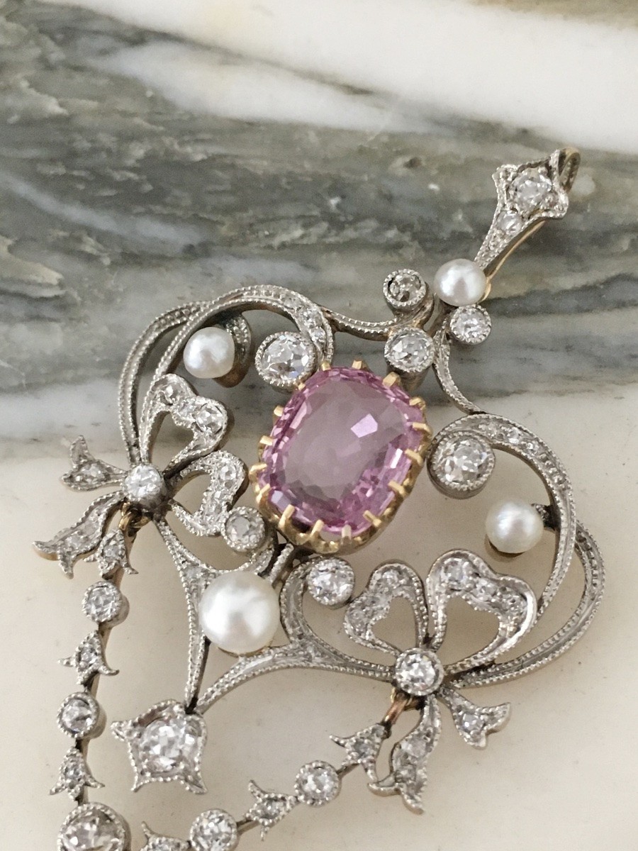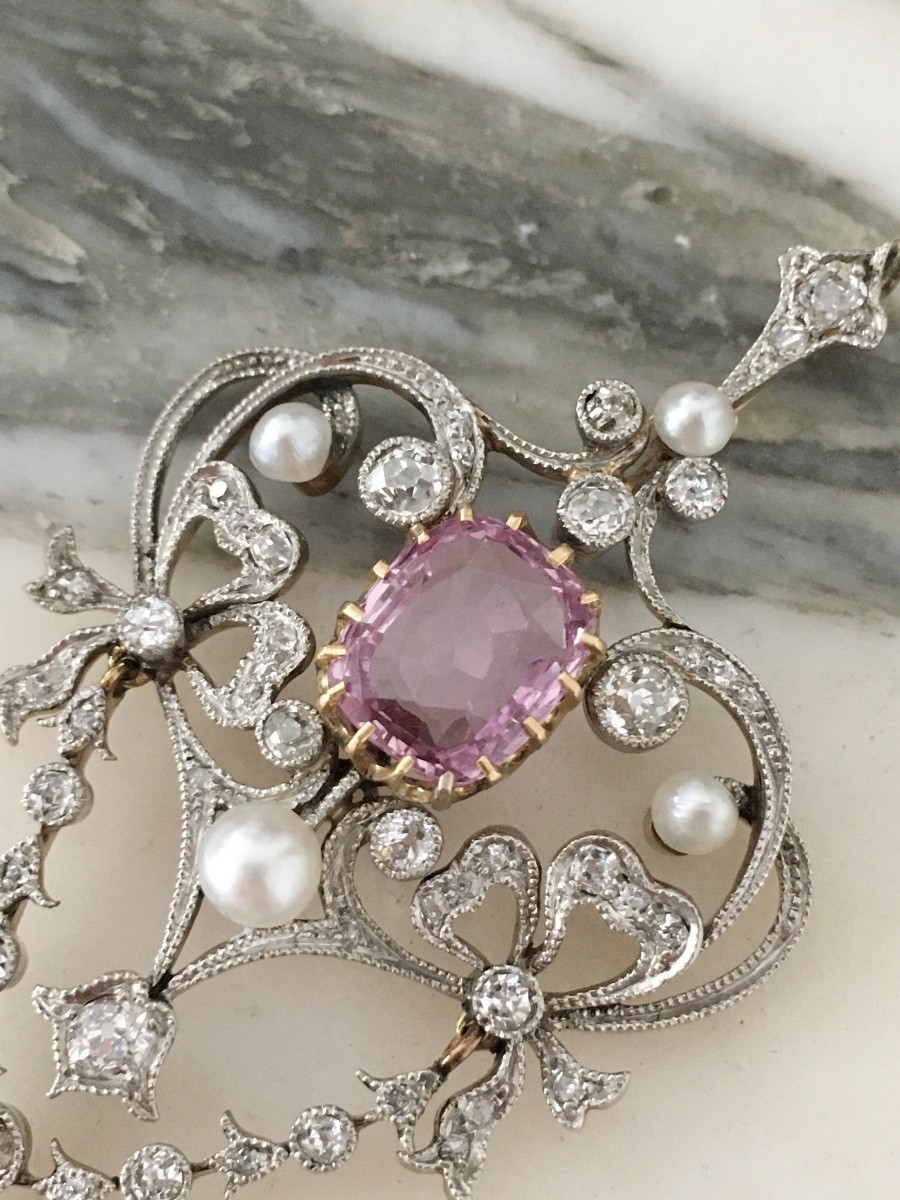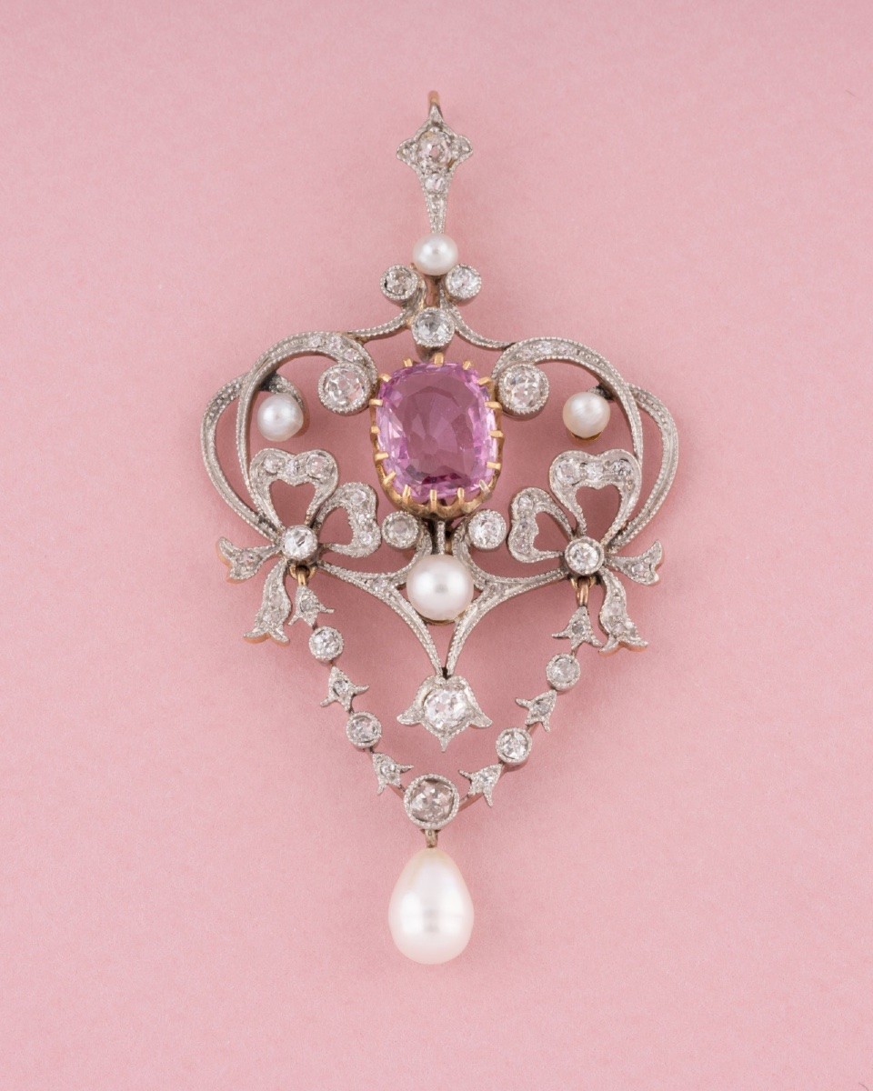 Retrouver le mobilier ou les objets d''art similaires à « Pendentif Belle Époque en or jaune et platine serti d’un saphir rose » présenté par Maison Tres Or, antiquaire à Etterbeek dans la catégorie Pendentif, Collier Art nouveau, Bijouterie, Joaillerie.
