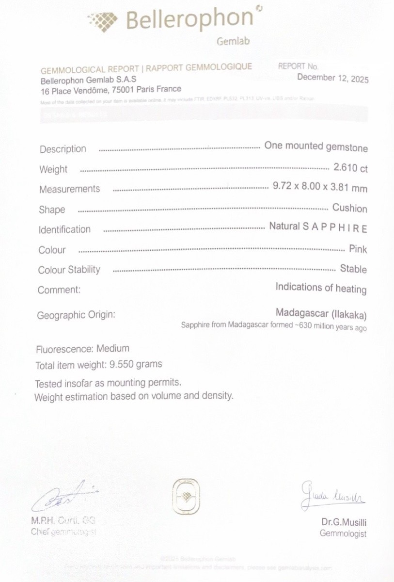 Accompagné d’un certificat du laboratoire Bellerphon Gemlab Paris pour le saphir rose.