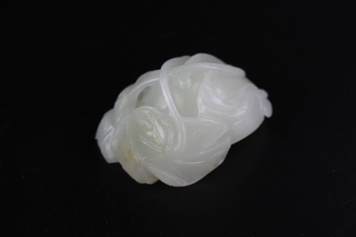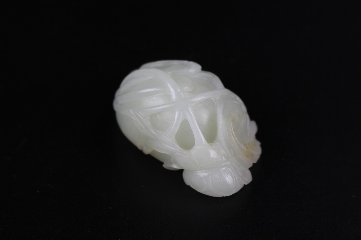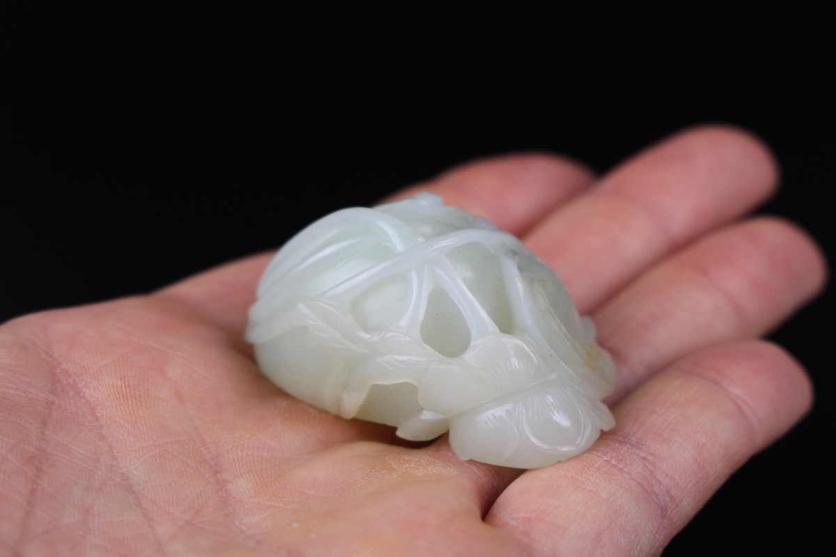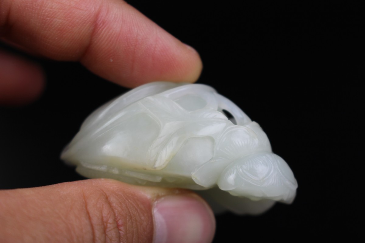 Finement sculpté en ajouré comme des feuilles de lotus et des gousses portées sur des tiges entrelacées formant les trous de cordon naturels pour le pendentif, un longicorne grimpant sur la plus grande gousse. La pierre translucide est d'un ton céladon proche du blanc à très pâle avec quelques inclusions roussâtres.