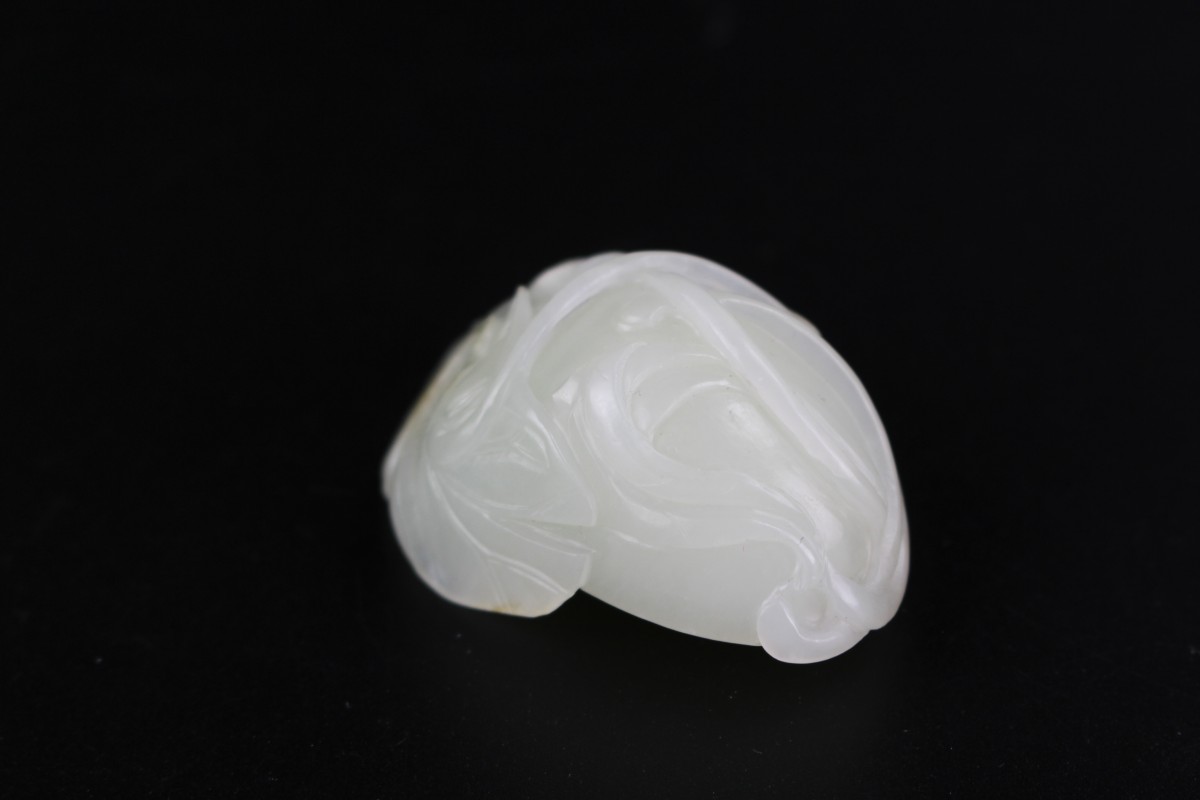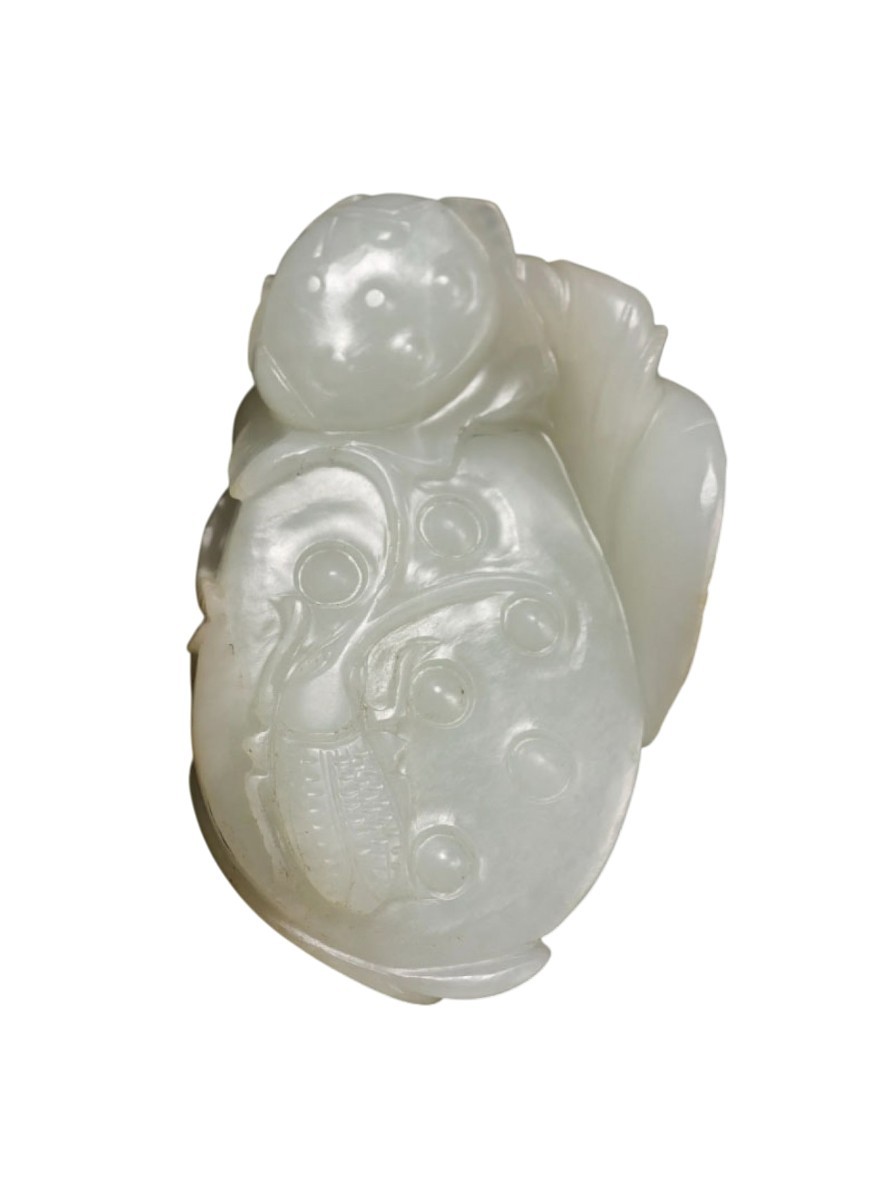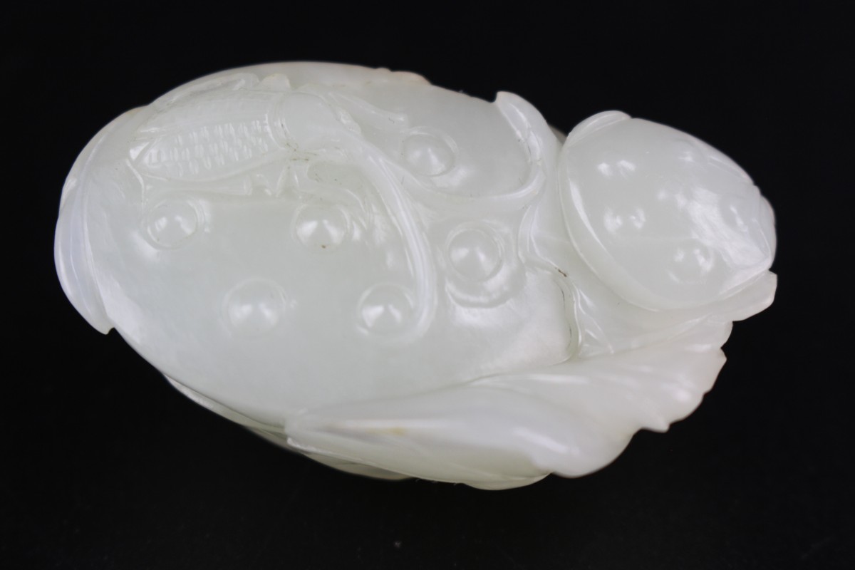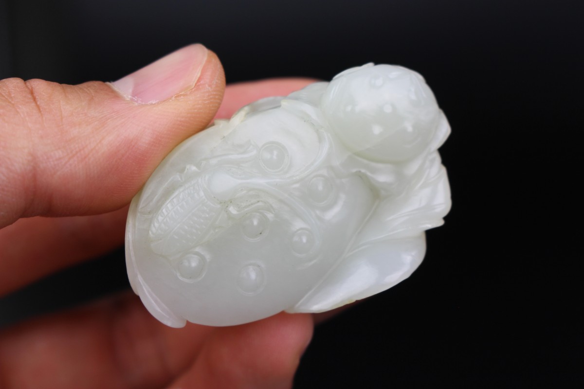 Finement sculpté en ajouré comme des feuilles de lotus et des gousses portées sur des tiges entrelacées formant les trous de cordon naturels pour le pendentif, un longicorne grimpant sur la plus grande gousse. La pierre translucide est d'un ton céladon proche du blanc à très pâle avec quelques inclusions roussâtres.