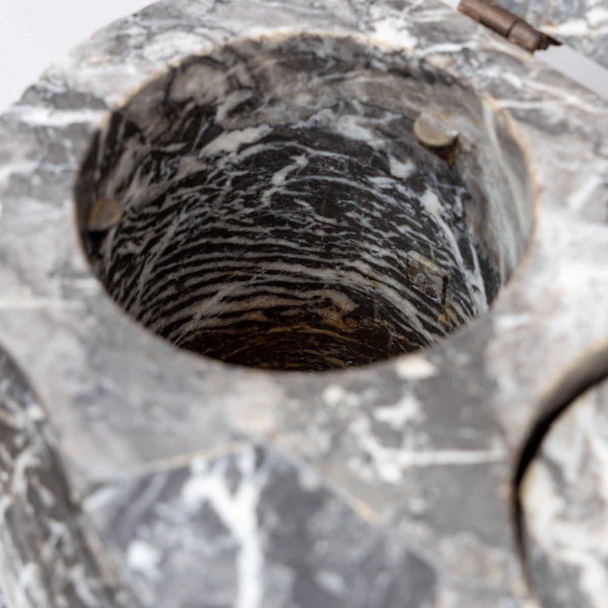 Petit coffre de rangement en marbre avec couvercle et compartiments cylindriques.