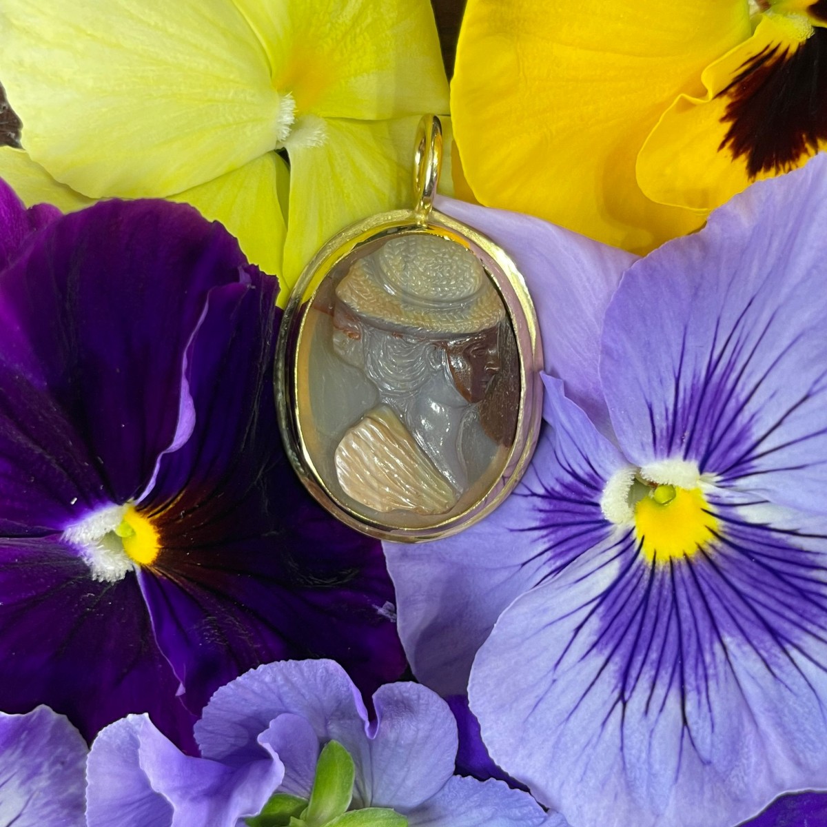 Un pendentif en or à haute teneur en carats serti d'un camée en agate tricolore inhabituel représentant une femme portant un chapeau de paille.