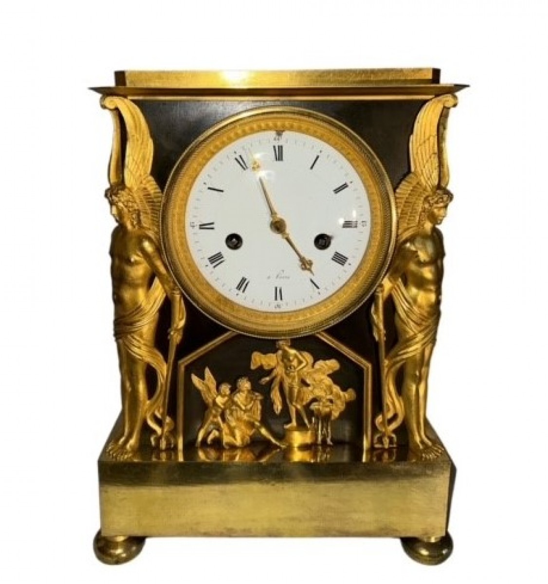 Bronze doré au mercure finement ciselé et bronze à patine brune, illustrant une scène antique. Les angles en façade flanqués de génies ailés.
