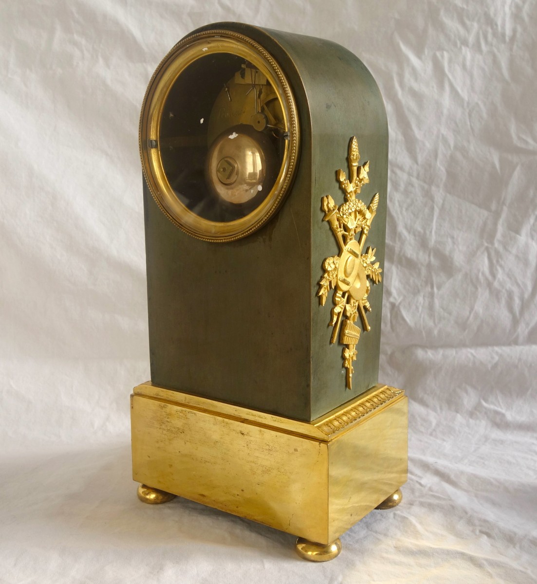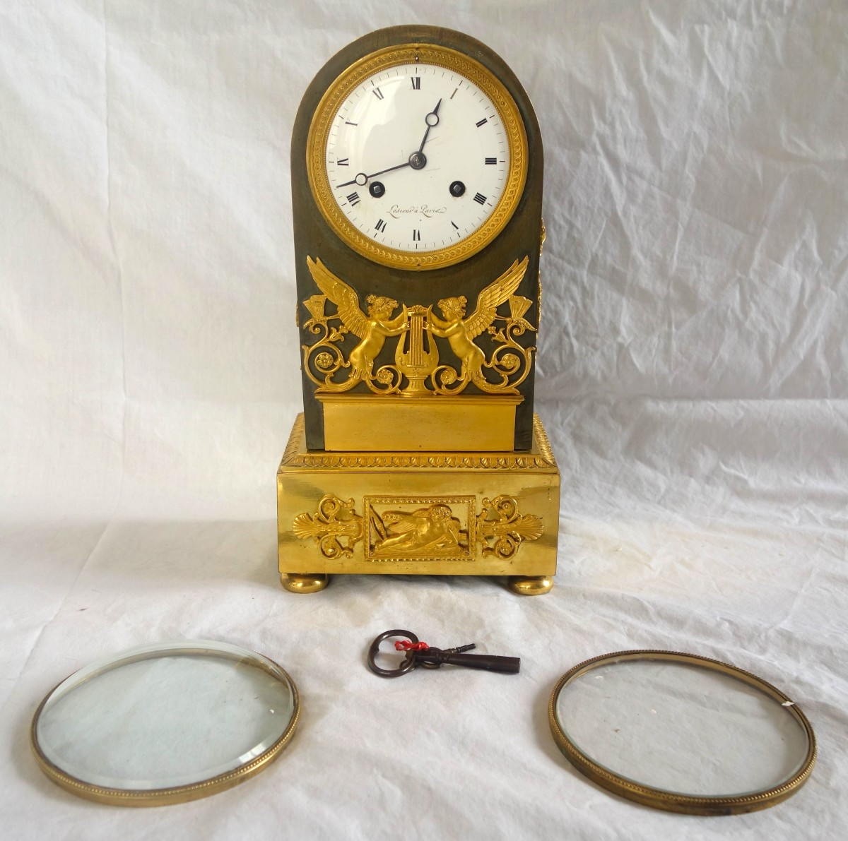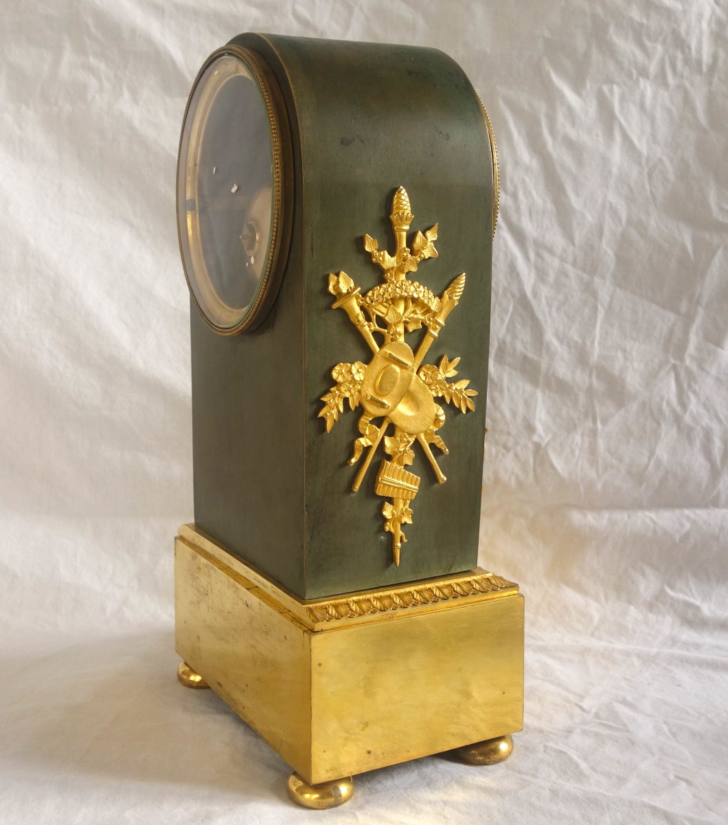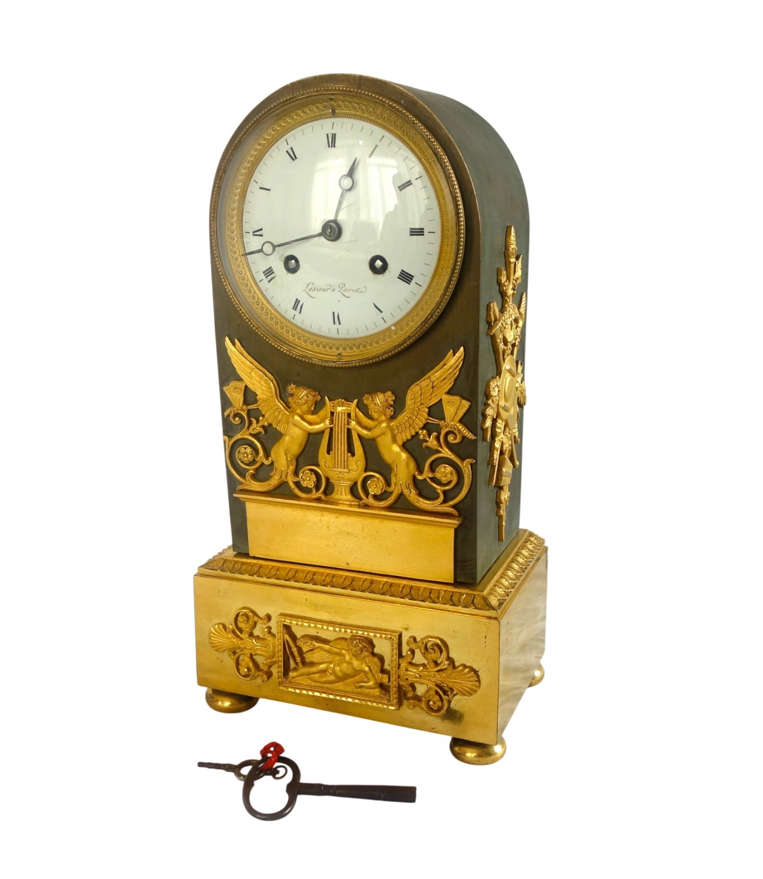 Pendule de forme borne en bronze ciselé et doré au mercure sur fond patiné vert. En façade, une paire de renommée ailées jouent da la harpe, sur la base un amour dans un cartouche rectangulaire. Les flancs ornés de trophées d'instruments de musique et de jardinage. Le cadran émaillé ainsi que le mécanisme à fil sont signés de Lesieur. Le très fin travail des bronzes est attribué à Thomire. La pendule a conservé ses 2 globes devant et derrière, ce qui est un autre signe de qualité. Epoque Empire-Restauration, années 1810.