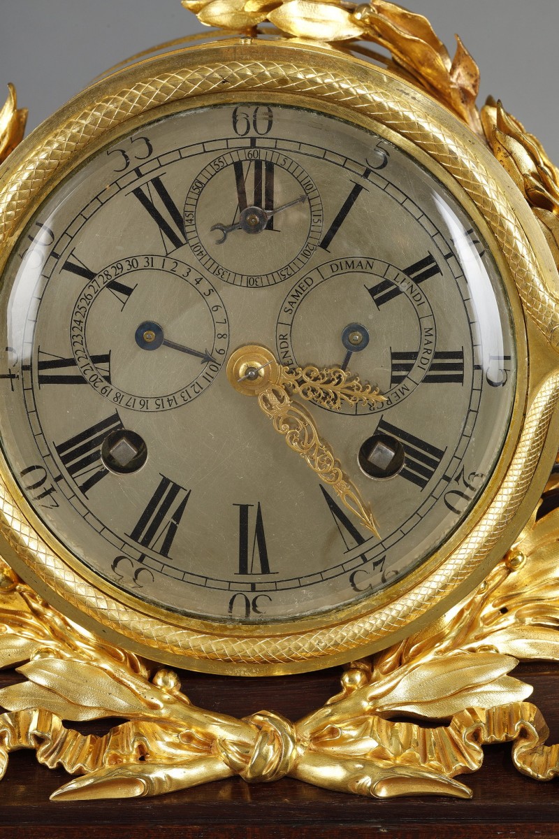 Ce cadran est cerclé d’un serpent se mordant la queue, un symbole intemporel de l’éternité et du renouvellement perpétuel (le cycle infini du temps). De part et d’autre, des couronnes de laurier et des rubans viennent souligner la noblesse de cette pendule et la dimension décorative.